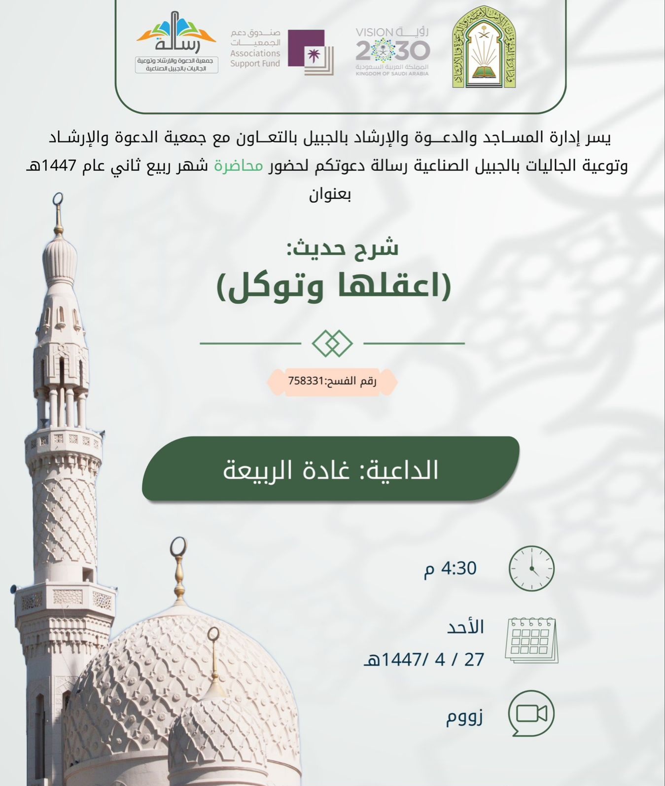فرع الشؤون الإسلامية بالشرقية ينفذ سلسلة من المحاضرات الدعوية بالجبيل ورأس تنورة والخبرنفذ فرع وزارة الشؤون الإسلامية والدعوة والإرشاد بالمنطقة الشرقية، بالتعاون مع جمعيات الدعوة والإرشاد وتوعية الجاليات فالجبيل وراس تنورة والخبر، أمس الأحد السابع والعشرين من شهر ربيع الآخر 1447هـ، سلسلة 27/ربيع الثاني/1447 التفاصيل