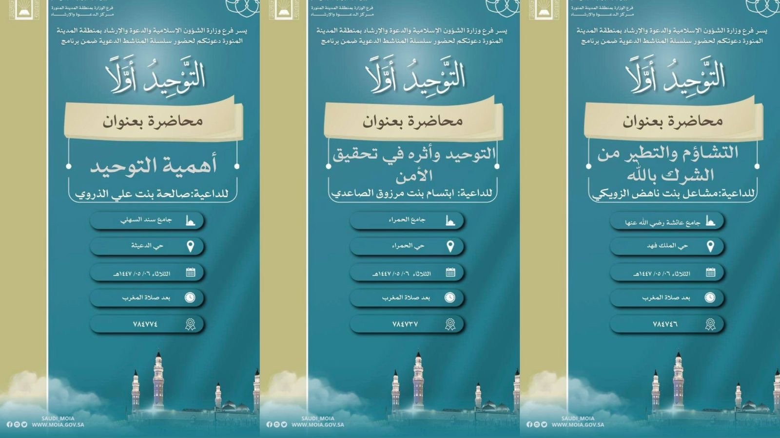 فرع الشؤون الإسلامية بالمدينة ينفذ سلسلة من المحاضرات الدعوية النسائية بجوامع المدينة المنورةنفذ فرع وزارة الشؤون الإسلامية بالمدينة المنورة، ممثلاً بمركز الدعوة والإرشاد بالمدينة، يوم الثلاثاء السادس من شهر جمادى الأولى ١٤٤٧هـ، سلسلة من المحاضرات الدعوية النسائية، وذلك ضمن برنامج "التوحيد 07/جمادى الأولى/1447 التفاصيل