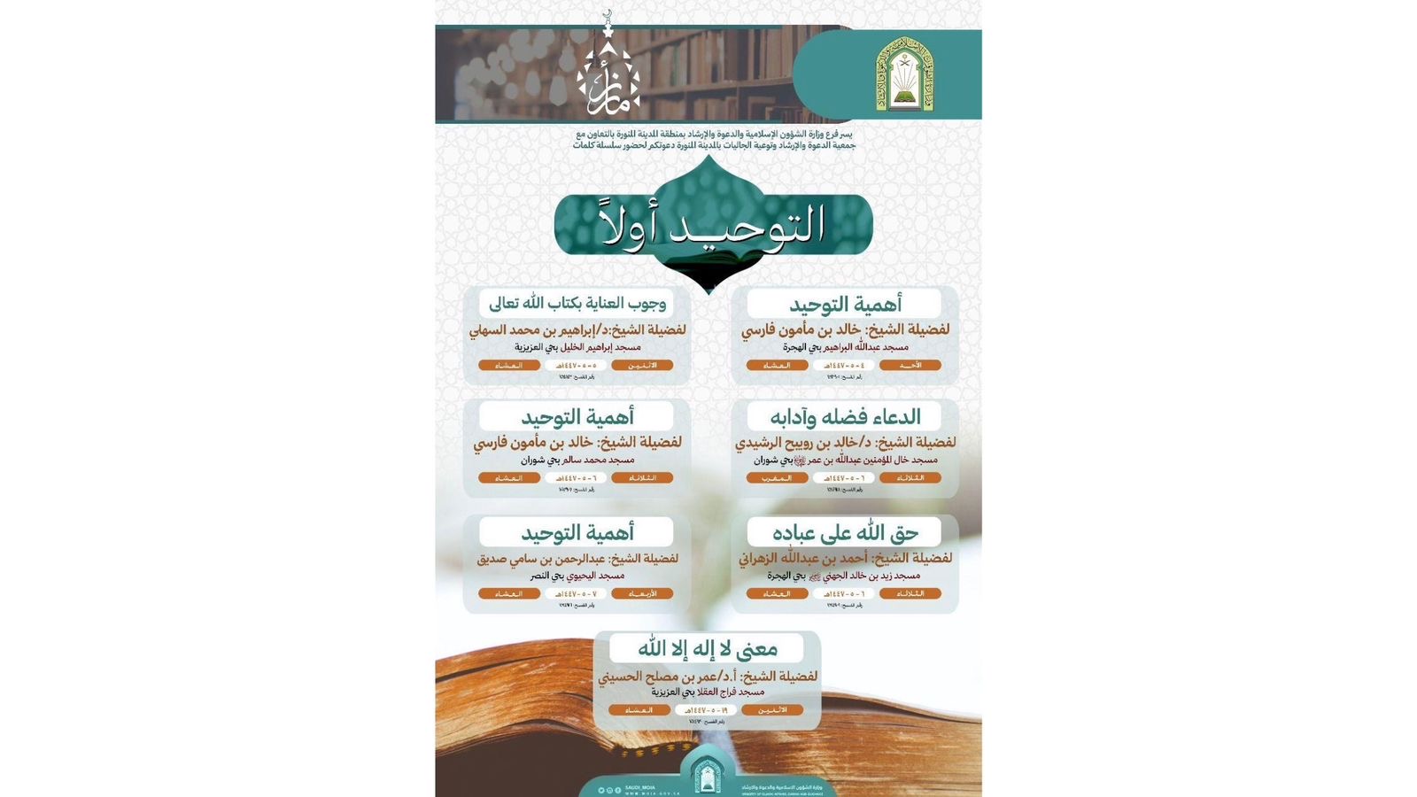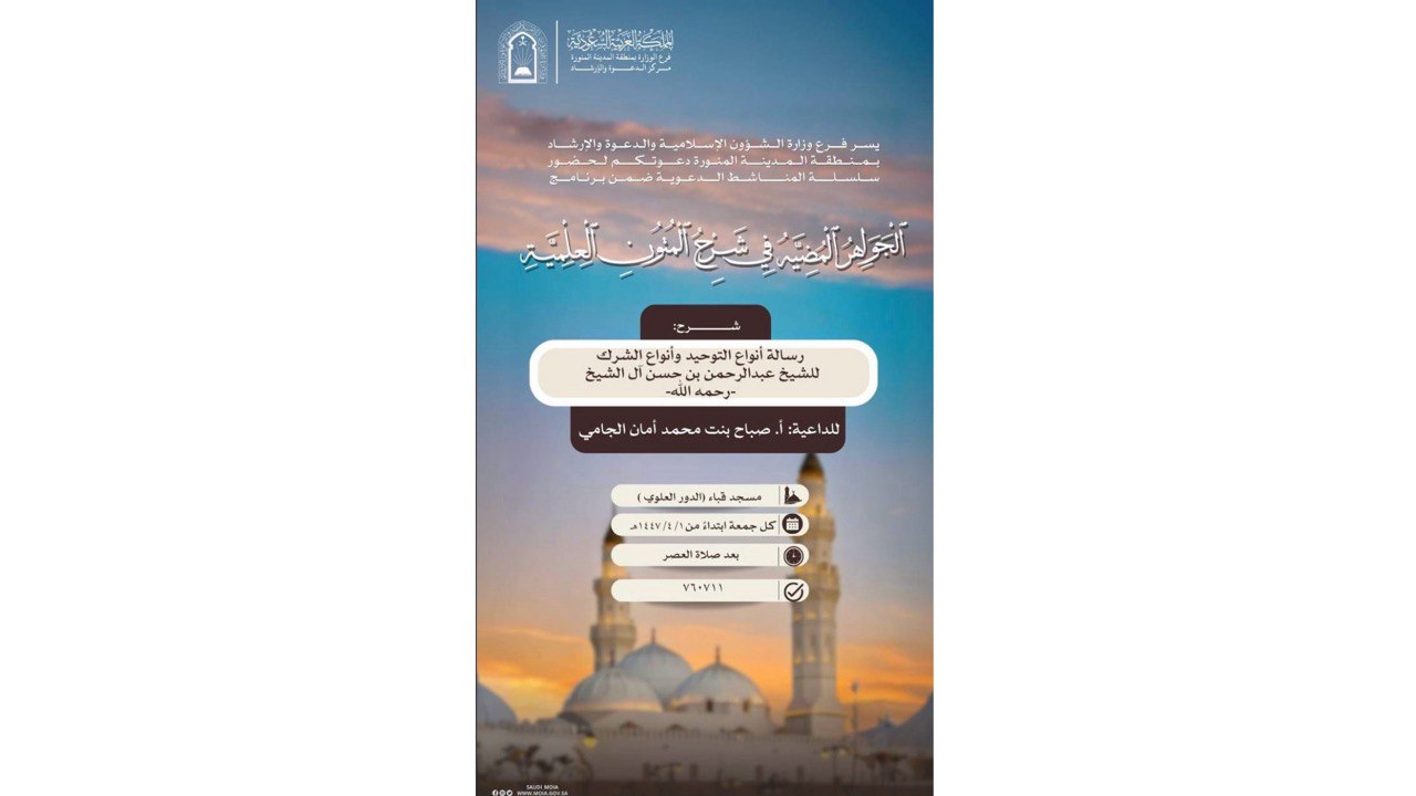 فرع الشؤون الإسلامية بالمدينة ينفذ درس علمي نسائي بمسجد قباءنفذ فرع وزارة الشؤون الإسلامية والدعوة والإرشاد بمنطقة المدينة المنورة ممثلاً بمركز الدعوة والإرشاد، يوم الجمعة الثاني من شهر جمادى الأولى ١٤٤٧هـ، درس علمي نسائي بعنوان: "رسالة أنواع التوحيد 02/جمادى الأولى/1447 التفاصيل