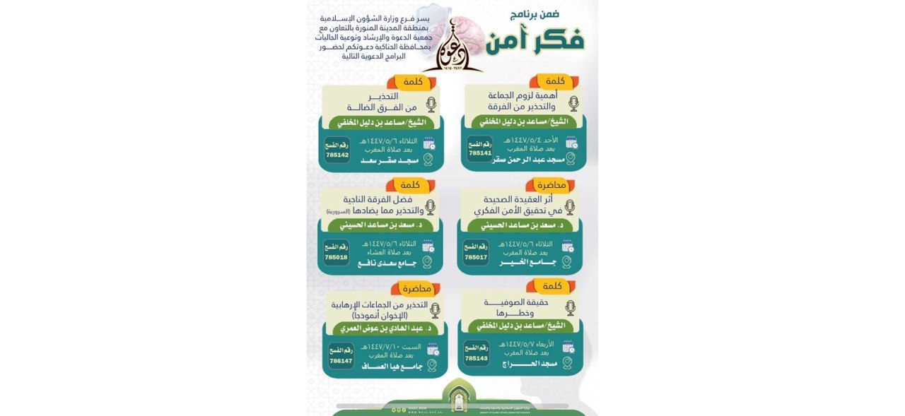 فرع الشؤون الإسلامية بالمدينة ينفذ سلسلة من الكلمات الدعوية بمساجد المدينة المنورةينفذ فرع وزارة الشؤون الإسلامية والدعوة والإرشاد بمنطقة المدينة المنورة، بالتعاون مع جمعية الدعوة والإرشاد وتوعية الجاليات بالمدينة المنورة، خلال الفترة من الثالث وحتى الخامس عشر من شهر جمادى الأولى لعام 05/جمادى الأولى/1447 التفاصيل