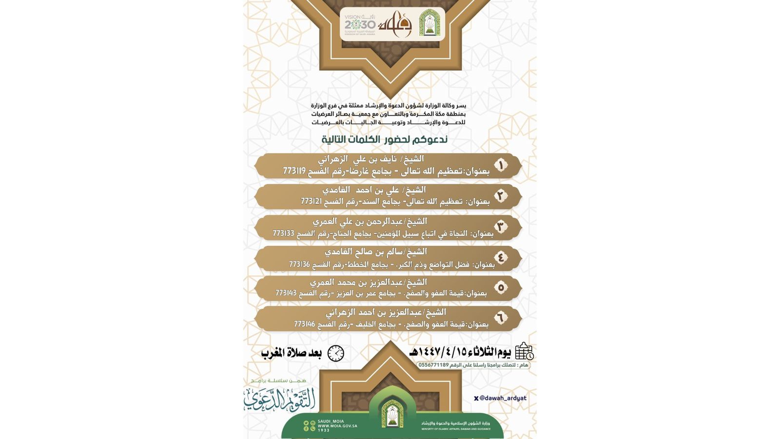 الشؤون الإسلامية بمكه تنظم سلسلة من المناشط الدعوية بمحافظة العرضياتنظم فرع وزارة الشؤون الإسلامية والدعوة والإرشاد ، ممثلاً بإدارة المساجد والدعوة والإرشاد بمحافظة العرضيات، مساء اليوم الثلاثاء الموافق 15 ربيع الآخر 1447هـ، بعد صلاة المغرب، من الكلمات الدعوية في عددٍ 15/ربيع الثاني/1447 التفاصيل
