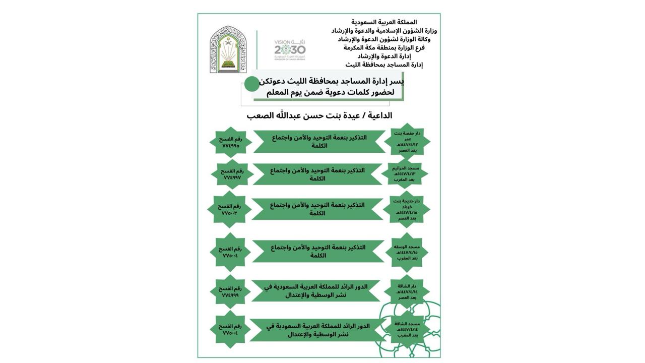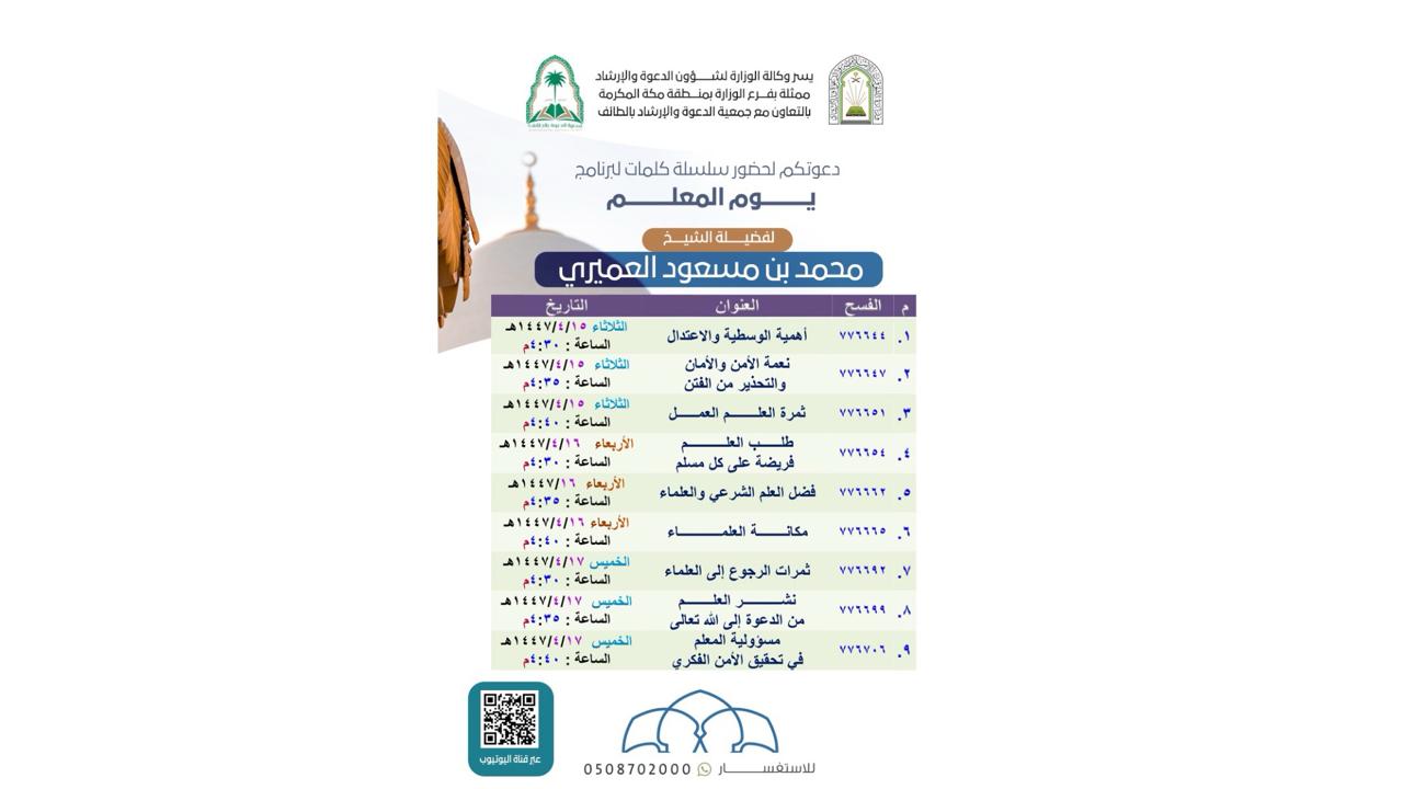 الشؤون الإسلامية بمكة تنفذ برنامجاً دعوياً بمناسبة اليوم العالمي للمعلم بمحافظة الطائفينفذ فرع وزارة الشؤون الإسلامية والدعوة والإرشاد بمنطقة مكة المكرمة، ممثلاً بإدارة المساجد والدعوة والإرشاد بمحافظة الطائف، برنامجاً دعوياً بمناسبة اليوم العالمي للمعلم الذي يوافق الخامس من شهر أكتوبر 16/ربيع الثاني/1447 التفاصيل