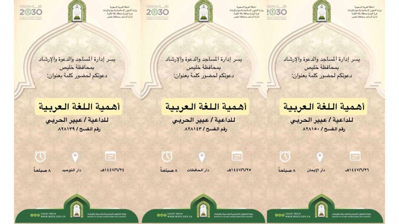 الشؤون الإسلامية بمكة المكرمة تنفّذ كلمات دعوية بعنوان «أهمية اللغة العربية» بمحافظة خليصنفّذت وزارةُ الشؤون الإسلاميةِ والدعوةِ والإرشاد ممثّلةً بفرعها في منطقة مكة المكرمة، عددًا من الكلمات الدعوية بعنوان «أهمية اللغة العربية»، وذلك تزامنًا مع اليوم العالمي للغة العربية. وأُقيمت الكلمات 25/جمادى الثانية/1447 التفاصيل