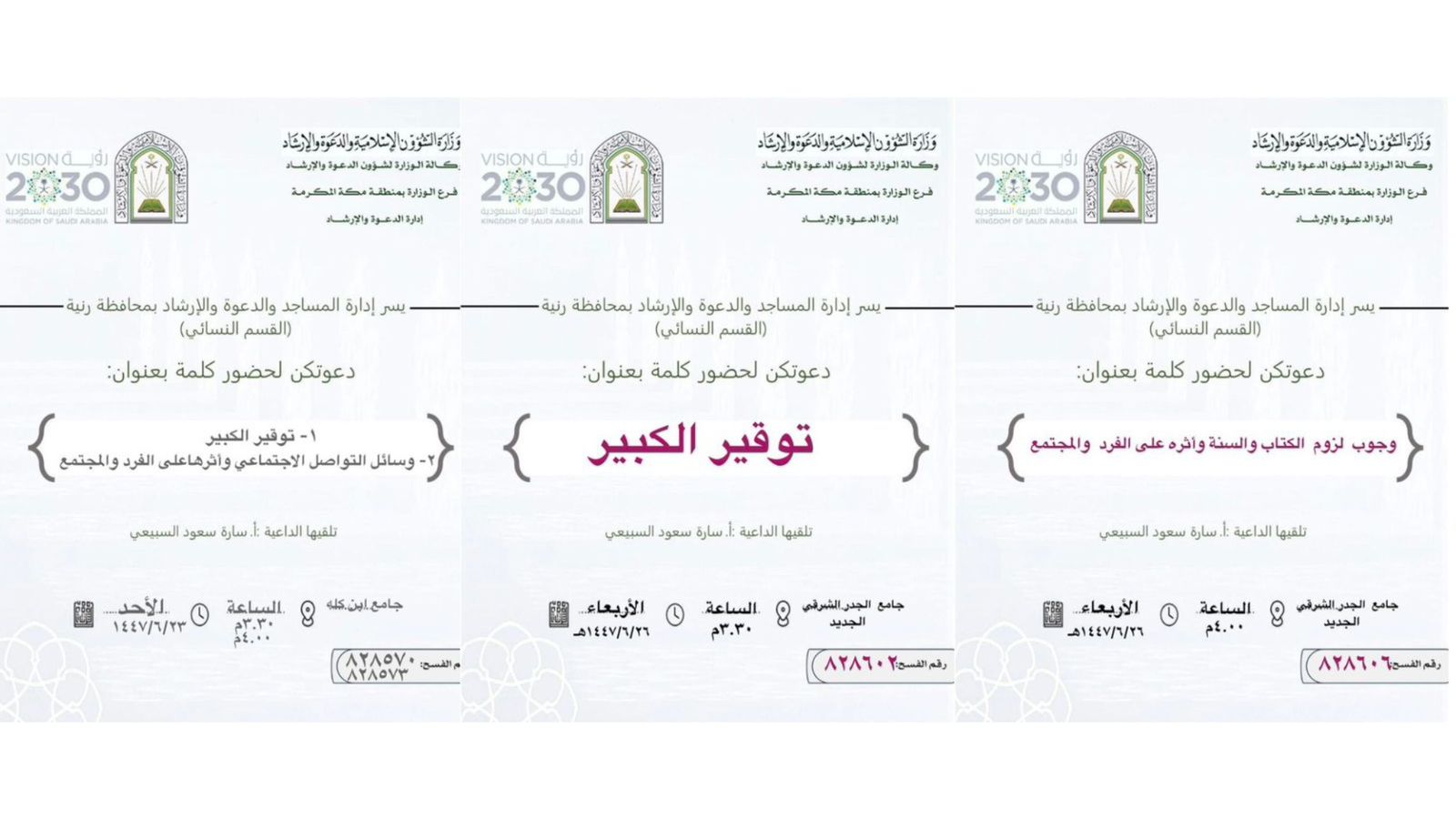 الشؤون الإسلامية بمكة المكرمة تنفّذ كلمات دعوية بمحافظة القنفذةنفّذت وزارةُ الشؤون الإسلاميةِ والدعوةِ والإرشاد، ممثّلةً بفرعها بمنطقة مكة المكرمة، وبالتعاون مع إدارة المساجد والدعوة والإرشاد بمحافظة القنفذة سلسلة من الكلمات دعوية بمحافظة القنفذة، وذلك خلال الفترة 23/جمادى الثانية/1447 التفاصيل