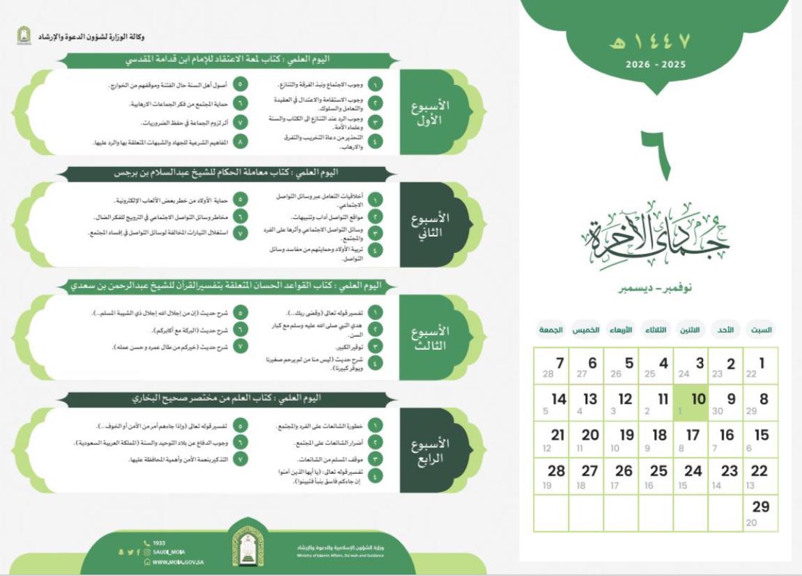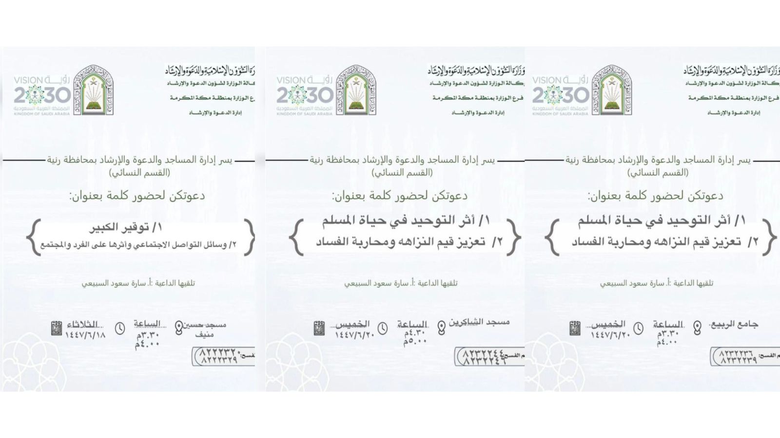 الشؤون الإسلامية بمكة تنفّذ عددًا من الكلمات الدعوية النسائية بمحافظة مكة المكرمةنفّذت وزارة الشؤون الإسلامية والدعوة والإرشاد، ممثلةً بفرعها في منطقة مكة المكرمة، خلال الفترة من 16 إلى 22 من شهر جمادى الآخرة لعام 1447هـ، سلسلة من الكلمات الدعوية النسائية في عددٍ من مساجد وجوامع مكة 18/جمادى الثانية/1447 التفاصيل