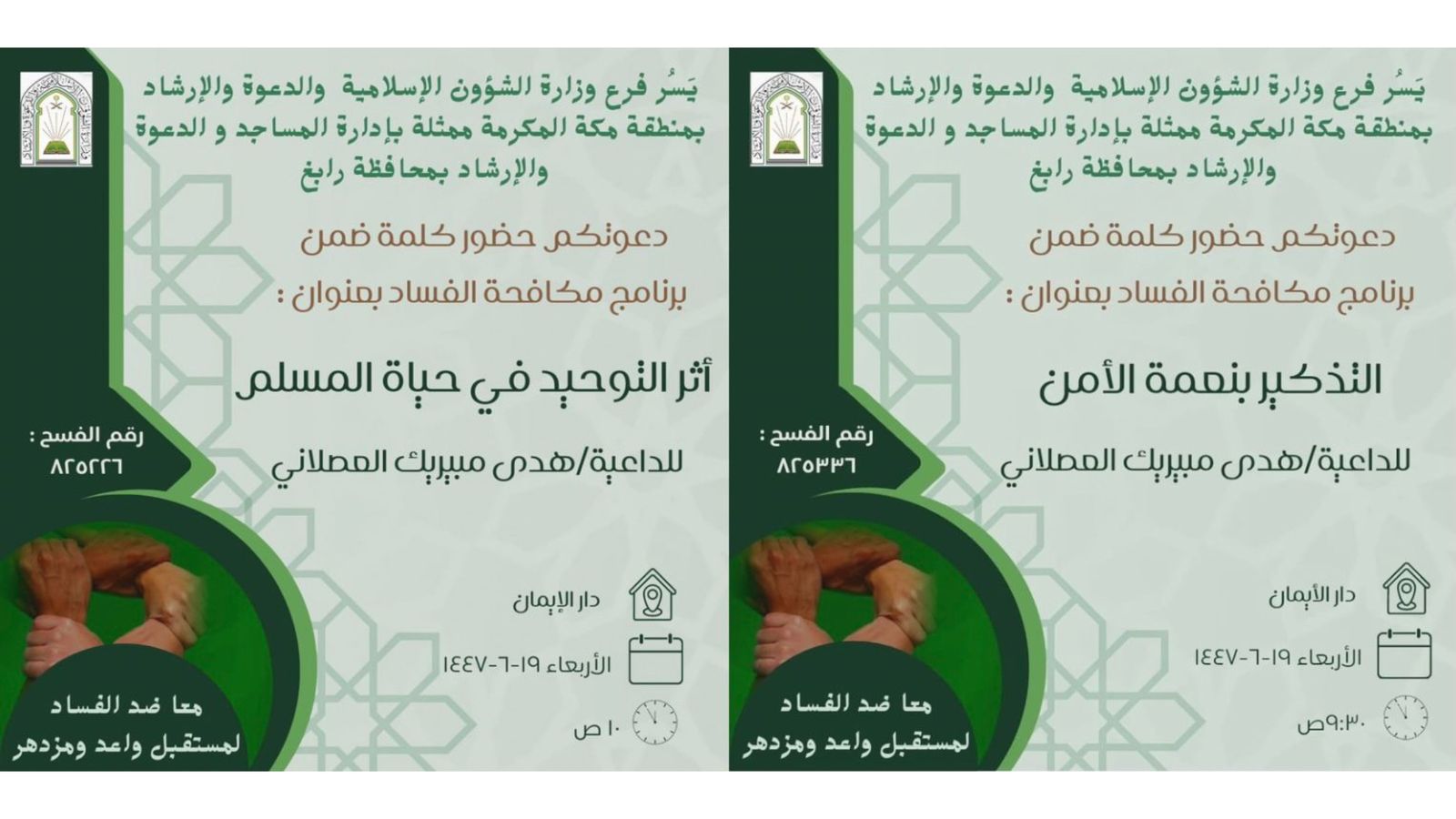 الشؤون الإسلامية بمكة المكرمة تنفّذ كلمات دعوية ضمن برنامج مكافحة الفساد بمحافظة رابغنفّذت وزارةُ الشؤون الإسلاميةِ والدعوةِ والإرشاد ممثلةً بفرعها في منطقة مكة المكرمة، وبالتعاون مع إدارة المساجد والدعوة والإرشاد بمحافظة رابغ، عددًا من الكلمات الدعوية ضمن برنامج مكافحة الفساد، وذلك يوم 19/جمادى الثانية/1447 التفاصيل