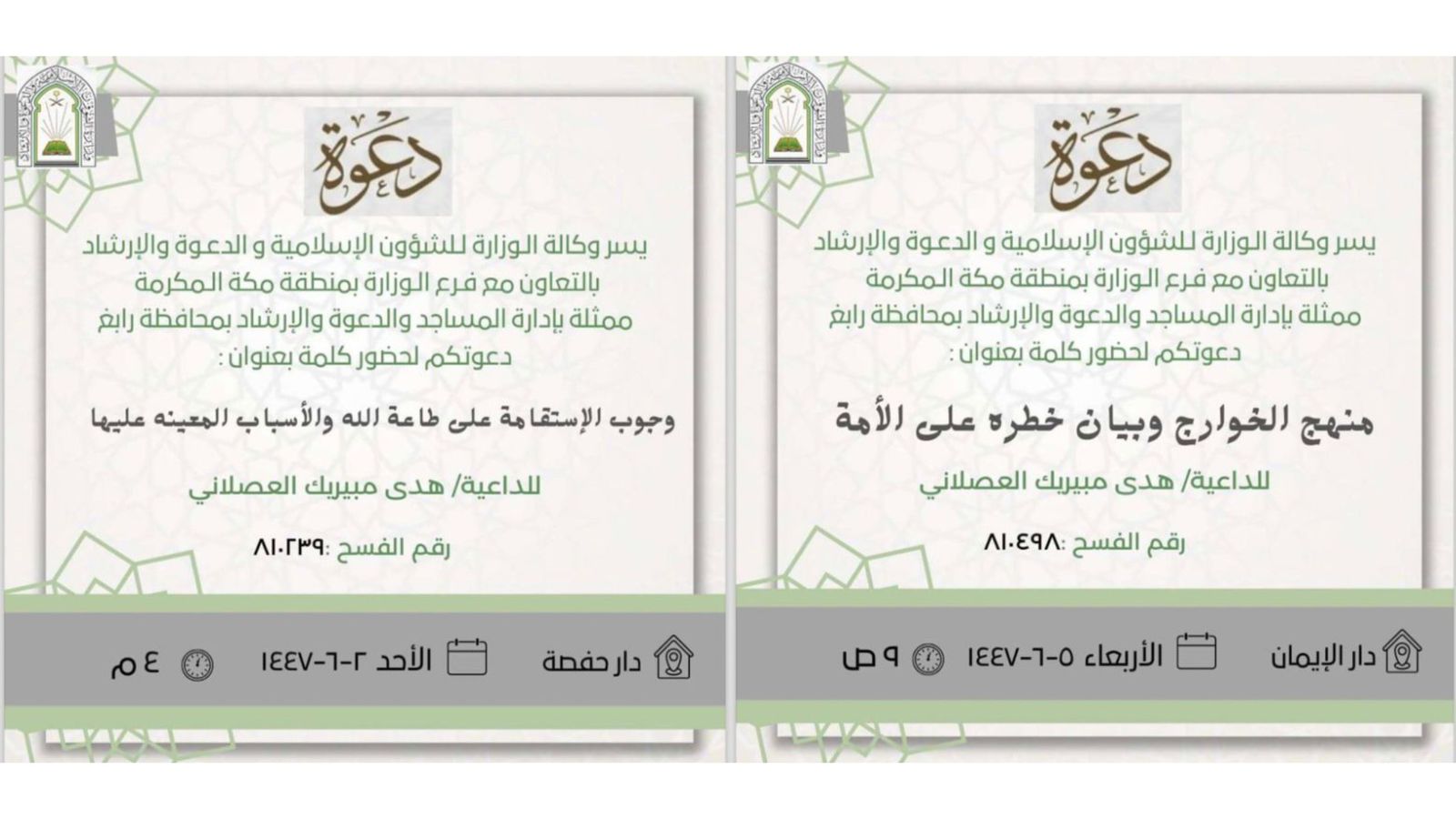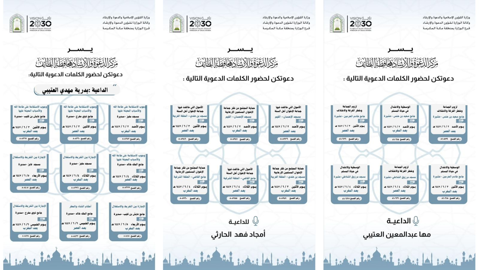 الشؤون الإسلامية بمكة تنفّذ سلسلة من الكلمات الدعوية في العاصمة المقدسةنفّذ فرع وزارة الشؤون الإسلامية والدعوة والإرشاد بمنطقة مكة المكرمة عددًا من الكلمات الدعوية ضمن برامجه التوعوية المستمرة، وذلك في جوامع ومساجد العاصمة المقدسة خلال الفترة من 2 إلى 8 جمادى الآخرة 1447هـ. وشملت 05/جمادى الثانية/1447 التفاصيل
