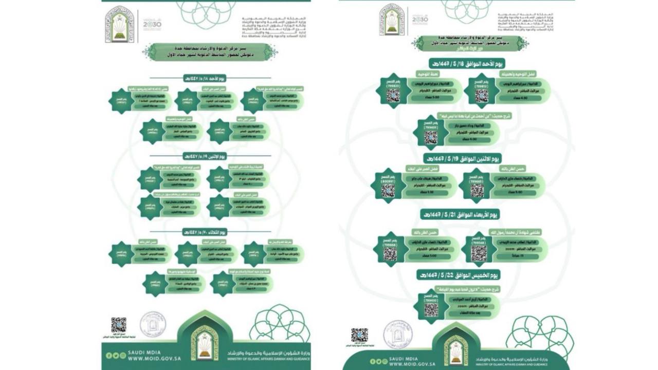 نظّم فرع وزارة الشؤون الإسلامية والدعوة والإرشاد بمنطقة مكة المكرمة، ممثلاً بإدارة المساجد والدعوة والإرشاد بمحافظة جدة، خلال الأسبوع الثالث من شهر جمادى الأولى لعام 1447هـ، سلسلةً من المناشط الدعوية