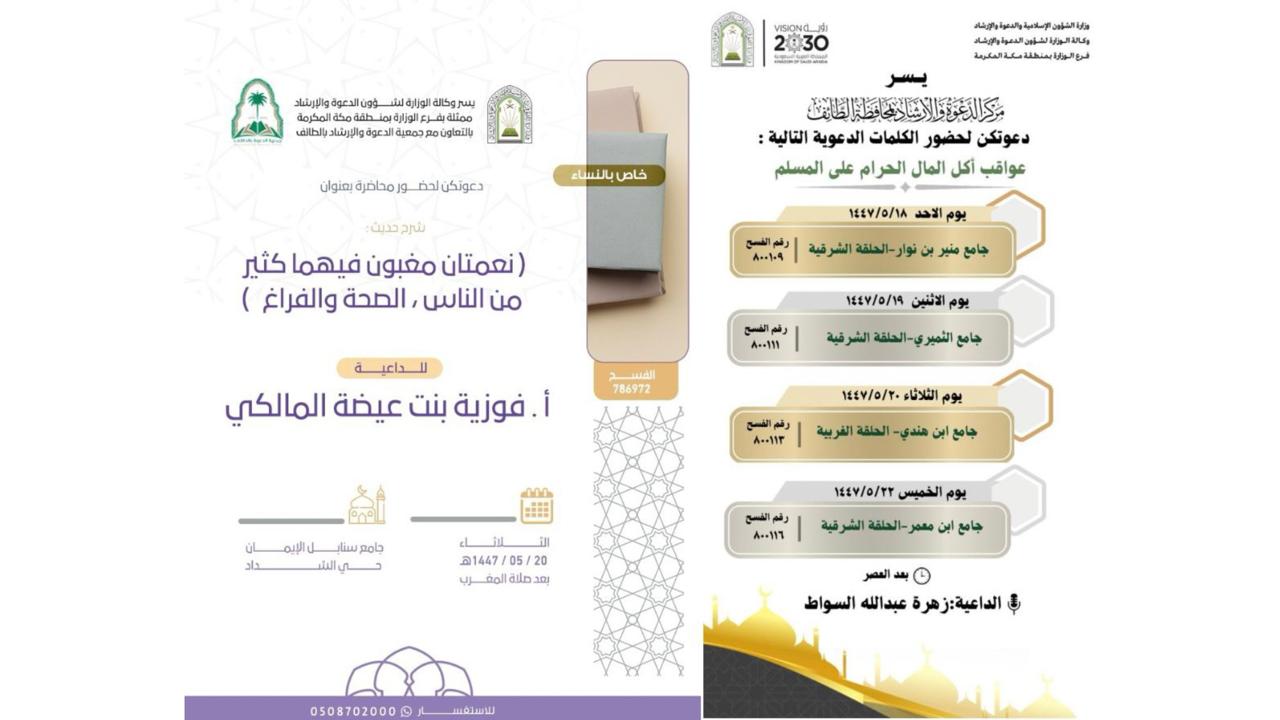 نفّذ فرع وزارة الشؤون الإسلامية والدعوة والإرشاد بمنطقة مكة المكرمة، ممثلاً بإدارة الدعوة والإرشاد، سلسلةً من المحاضرات والكلمات الدعوية النسائية خلال الفترة من 18 إلى 24 جمادى الأولى 1447هـ، وذلك في