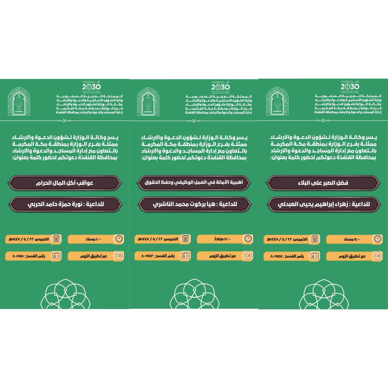 ​نفذ فرع وزارة الشؤون الإسلامية والدعوة والإرشاد بمنطقة مكة المكرمة، ممثلاً بإدارة المساجد بمحافظة القنفذة، خلال الفترة من 19-22 جمادى الأولى 1447 هـ، سلسلة من الكلمات الدعوية التي تنفذ في المساجد والجوامع