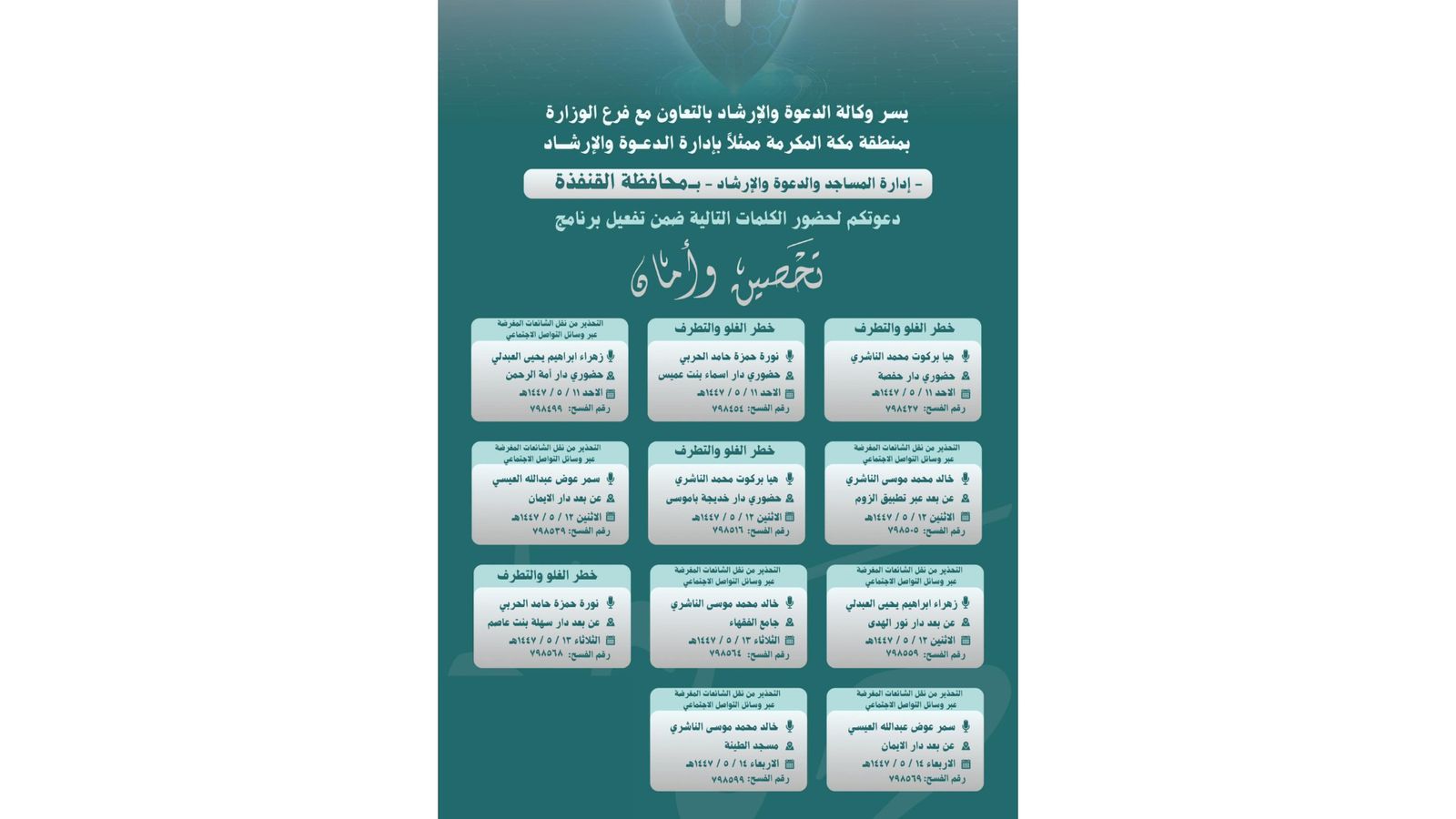 الشؤون الإسلاميه بمكة المكرمة تنفذ عدد من الكلمات الدعوية النسائيه ضمن برنامج تحصين وامان بمحافظة القنفذةنفذ فرع وزارة الشؤون الإسلامية والدعوة والإرشاد بمنطقة مكة المكرمة، ممثلاً بإدارة المساجد والدعوة والإرشاد بمحافظة القنفذة، خلال الفترة من 11- 14 من شهر جمادى الأولى لعام 1447 هـ ، سلسلة من الكلمات 15/جمادى الأولى/1447 التفاصيل