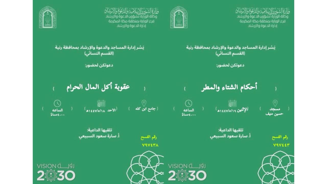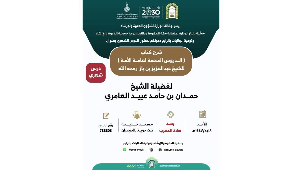 الشؤون الإسلامية بمكة تنظم درس شهري لشرح كتاب "الدروس المهمه لعامة الناس " للشيخ عبدالعزيز بن باز رحمه الله بمحافظة العرضيات .ينظم فرع وزارة الشؤون الإسلامية والدعوة والإرشاد بمنطقة مكة المكرمة، ممثلاً بإدارة المساجد بمحافظة العرضيات ، وبالتعاون مع جمعية الدعوة والإرشاد وتوعية الجاليات بالرايم، اليوم الاحد الموافق 18 جمادى 18/جمادى الأولى/1447 التفاصيل