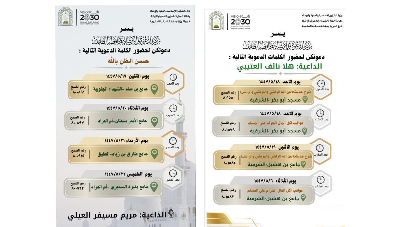 “الشؤون الإسلامية بمكة” تنفذ محاضرات وكلمات دعويه في عدد من الجهات الحكومية .نفذ فرع وزارة الشؤون الإسلامية والدعوة والإرشاد بمنطقة مكة المكرمة، بالتعاون مع عدد من الجهات الحكومية، سلسلة من المناشط الدعوية والمحاضرات والدروس العلمية، وذلك خلال الفترة من ١٨ إلى ٢٤ من شهر جمادى 19/جمادى الأولى/1447 التفاصيل