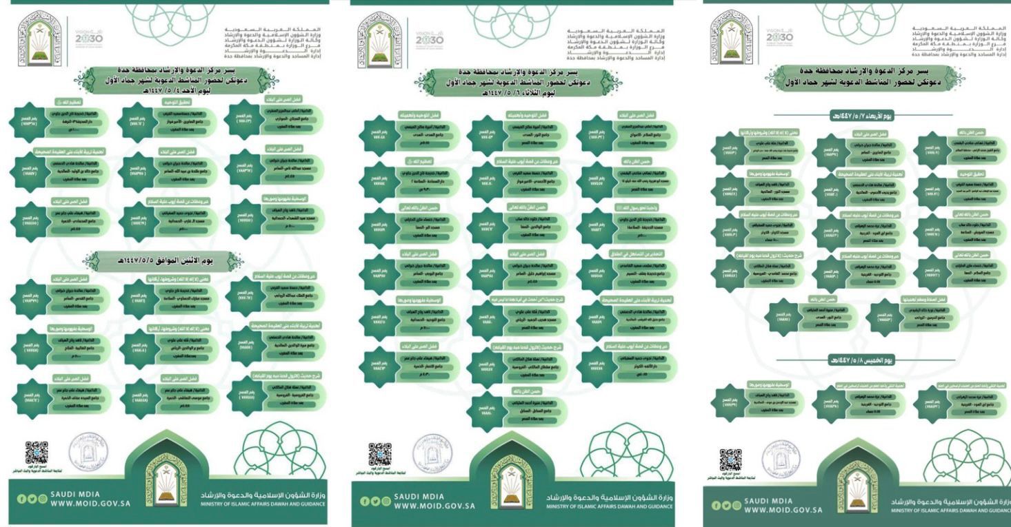 فرع الشؤون الإسلامية بمكة المكرمة ينظّم سلسلة من المناشط الدعوية بمحافظة جدةنظّم فرع وزارة الشؤون الإسلامية والدعوة والإرشاد بمنطقة مكة المكرمة، ممثلاً بإدارة الدعوة والإرشاد، سلسلة من المناشط الدعوية لشهر جمادى الأولى بمحافظة جدة، خلال الفترة من الرابع إلى الثامن من شهر جمادى 06/جمادى الأولى/1447 التفاصيل