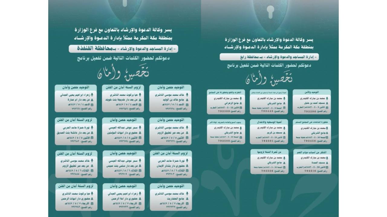 "الشؤون الإسلامية بمكة المكرمة " تنفذ عدد من الكلمات بمحافظة القنفذة ضمن التقويم الدعوييُنفّذ فرع وزارة الشؤون الإسلامية والدعوة والإرشاد بمنطقة مكة المكرمة، ممثلاً في إدارة المساجد والدعوة والإرشاد بمحافظة القنفذة، وبالتعاون مع جمعية الدعوة والإرشاد وتوعية الجاليات بالقنفذة، مجموعة من 05/جمادى الأولى/1447 التفاصيل