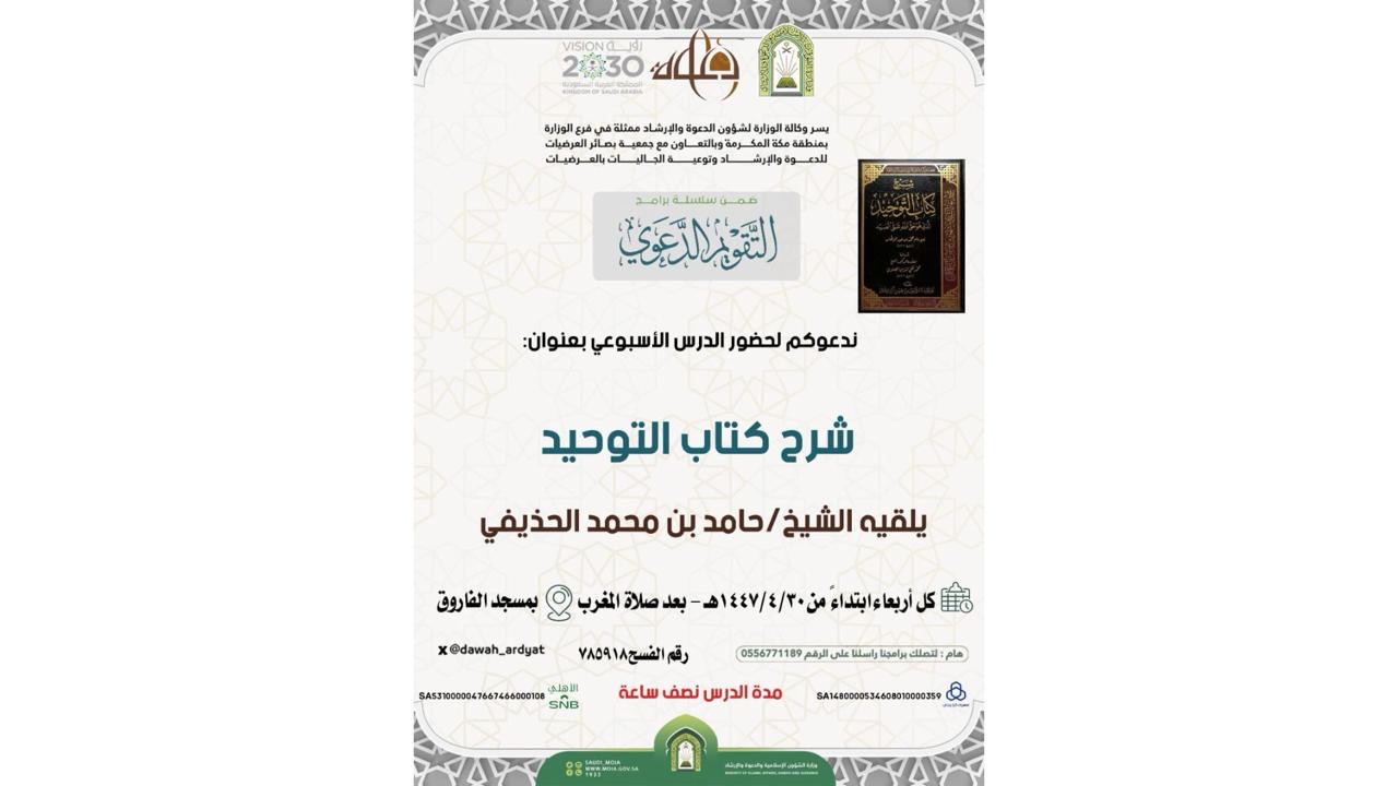 الشؤون الإسلامية بمكة تنظم درس أسبوعي لشرح كتاب التوحيد بمحافظة العرضياتنظم فرع وزارة الشؤون الإسلامية والدعوة والإرشاد بمنطقة مكة المكرمة، ممثلاً بإدارة المساجد والدعوة والإرشاد بمحافظة العرضيات ، يوم الأربعاء الموافق 30 ربيع الثاني 1447هـ، درس أسبوعي لشرح كتاب التوحيد، 03/جمادى الأولى/1447 التفاصيل