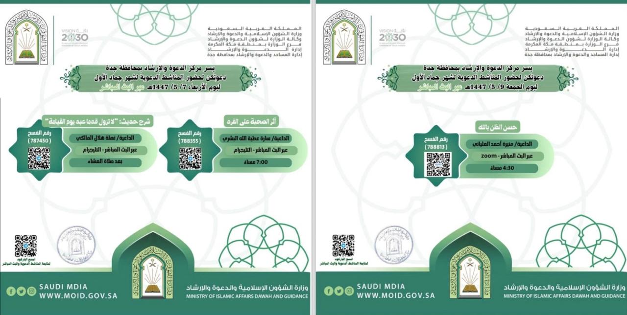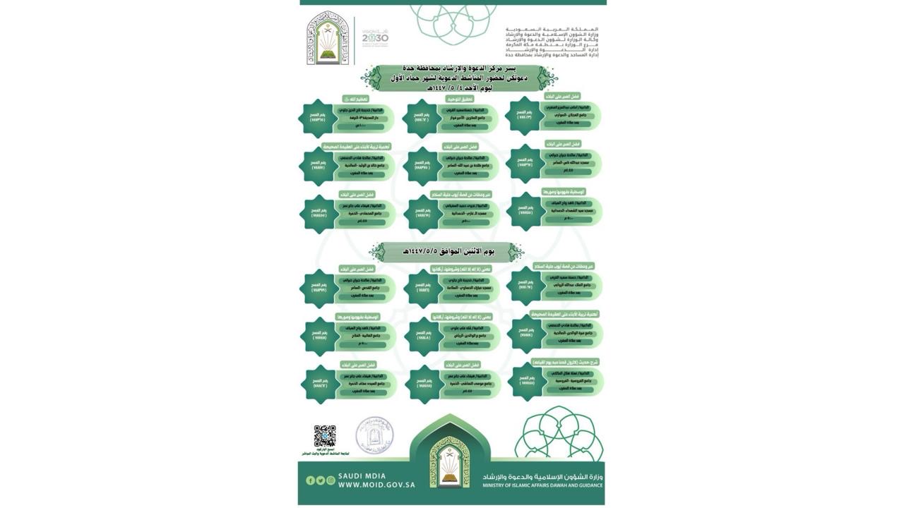 الشؤون الإسلامية بمكة المكرمة تواصل تنفيذ المناشط الدعوية عن بُعد بمحافظة جدةيواصل فرع وزارة الشؤون الإسلامية والدعوة والإرشاد بمنطقة مكة المكرمة، ممثلاً في مركز الدعوة والإرشاد بمحافظة جدة، تنفيذ مجموعة من المناشط الدعوية عن بُعد خلال الفترة من 5 إلى 9 جمادى الأولى 1447هـ، وذلك 04/جمادى الأولى/1447 التفاصيل