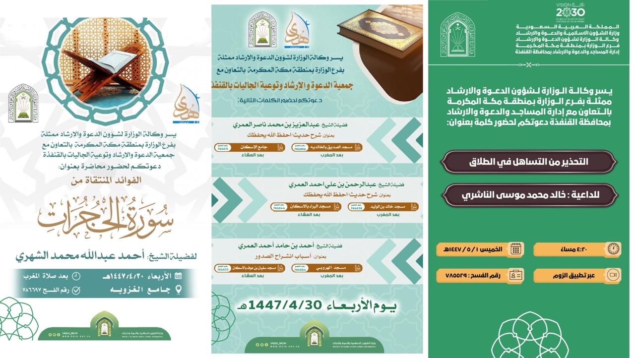الشؤون الإسلامية بمكة المكرمة تنظم سلسلة من الكلمات الدعوية بمحافظة الطائفنظّم فرع وزارة الشؤون الإسلامية والدعوة والإرشاد بمنطقة مكة المكرمة، ممثلاً في إدارة الدعوة والإرشاد بمحافظة الطائف، سلسلة من الكلمات الدعوية خلال الفترة من 4 إلى 8 جمادى الأولى 1447هـ. وتناولت الكلمات 04/جمادى الأولى/1447 التفاصيل