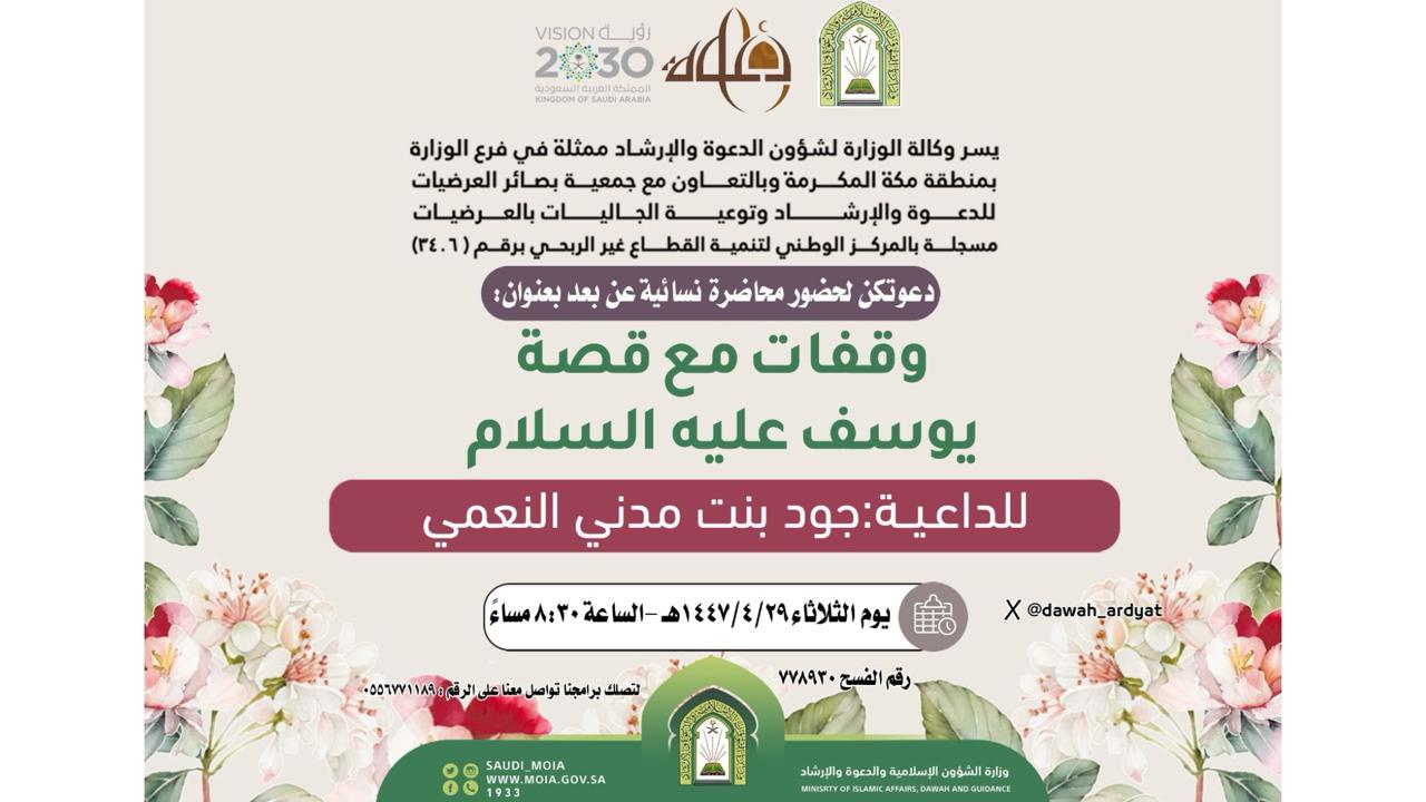 الشؤون الإسلامية بمكة المكرمة تنظم محاضرة نسائية بعنوان “وقفات مع قصة يوسف عليه السلام” بمحافظة العرضياتظم فرع وزارة الشؤون الإسلامية والدعوة والإرشاد بمنطقة مكة المكرمة، ممثلاً بإدارة المساجد والدعوة والإرشاد بمحافظة العرضيات، يوم الثلاثاء 29 ربيع الآخر 1447هـ، محاضرة نسائية بعنوان “وقفات مع قصة يوسف عليه 29/ربيع الثاني/1447 التفاصيل
