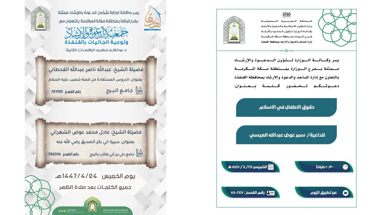 الشؤون الإسلامية بمكة تنظم سلسلة من الكلمات الدعوية النسائيه بمحافظة القنفذةينظم فرع وزارة الشؤون الإسلامية والدعوة والإرشاد بمنطقة مكة المكرمة، ممثلاً بإدارة المساجد والدعوة والإرشاد بمحافظة القنفذة، خلال الأسبوع الجاري ابتداءً من يوم الأحد الموافق 27 ربيع الثاني 1447هـ، سلسلة 28/ربيع الثاني/1447 التفاصيل