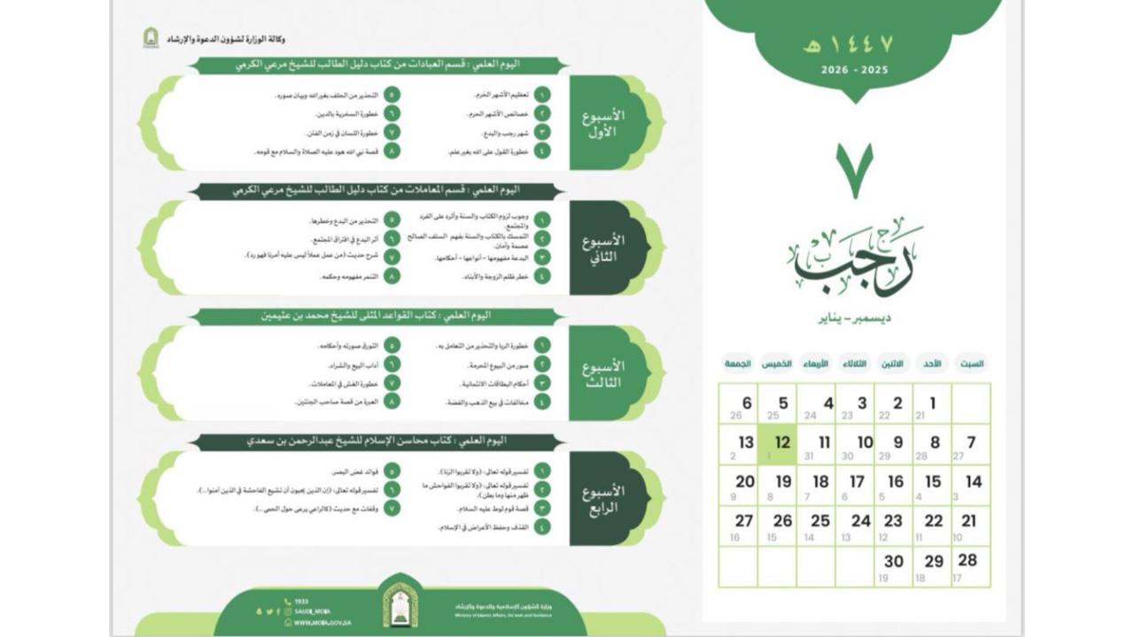 الشؤون الإسلامية بمكة المكرمة تنفذ محاضرات وكلمات دعوية في عدد من الجهات الحكوميةنفذت وزارة الشؤون الإسلامية والدعوة والإرشاد، ممثلةً بفرعها في منطقة مكة المكرمة، وبالتعاون مع عدد من الجهات الحكومية، سلسلة من المناشط الدعوية والمحاضرات والدروس العلمية، وذلك خلال الفترة من 15 إلى 17/رجب/1447 التفاصيل