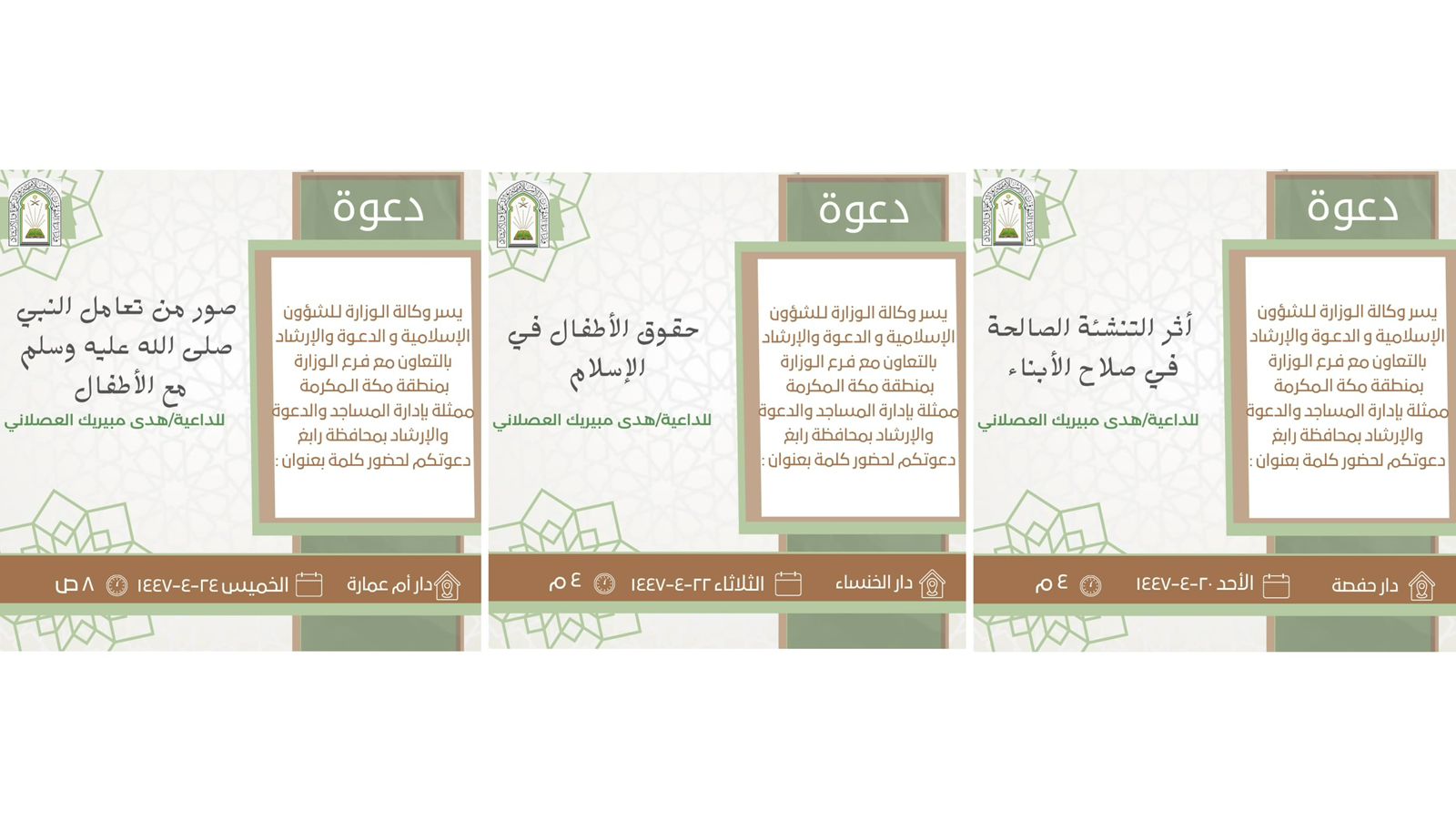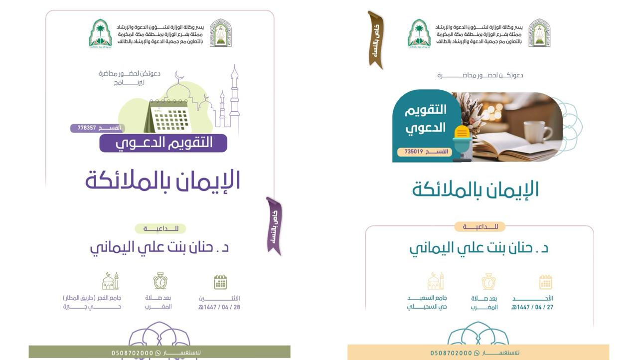 الشؤون الإسلامية بمكة المكرمة تنظم سلسلة من المحاضرات الدعوية النسائية بمحافظة الطائفينظم فرع وزارة الشؤون الإسلامية والدعوة والإرشاد بمنطقة مكة المكرمة، ممثلاً بإدارة المساجد والدعوة والإرشاد بمحافظة الطائف، سلسلة من المحاضرات الدعوية النسائية ضمن التقويم الدعوي في عددٍ من الجوامع والمساجد 28/ربيع الثاني/1447 التفاصيل