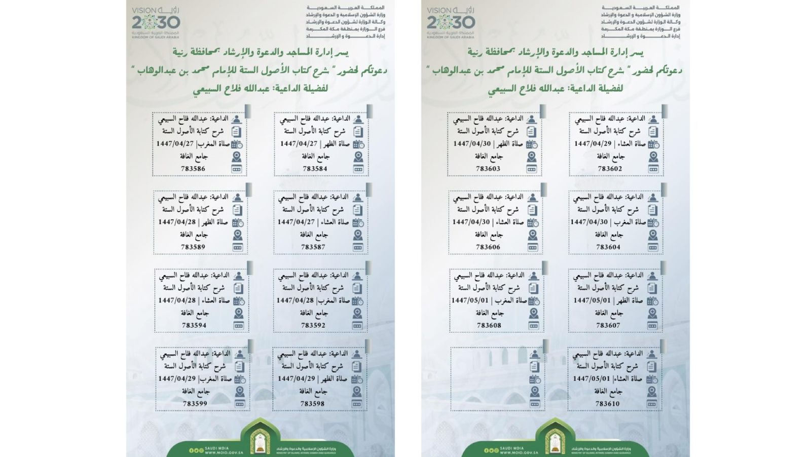 الشؤون الإسلامية بمكة المكرمة تنظم سلسلة من الكلمات الدعوية في عدد من الجهات الحكوميةينظم فرع وزارة الشؤون الإسلامية والدعوة والإرشاد بمنطقة مكة المكرمة، خلال الفترة من 20 – 24 من شهر ربيع الآخر لعام 1447هـ، سلسلة من الكلمات التوعوية بالتعاون مع عدد من الجهات الحكومية والأمنية، وذلك في 23/ربيع الثاني/1447 التفاصيل