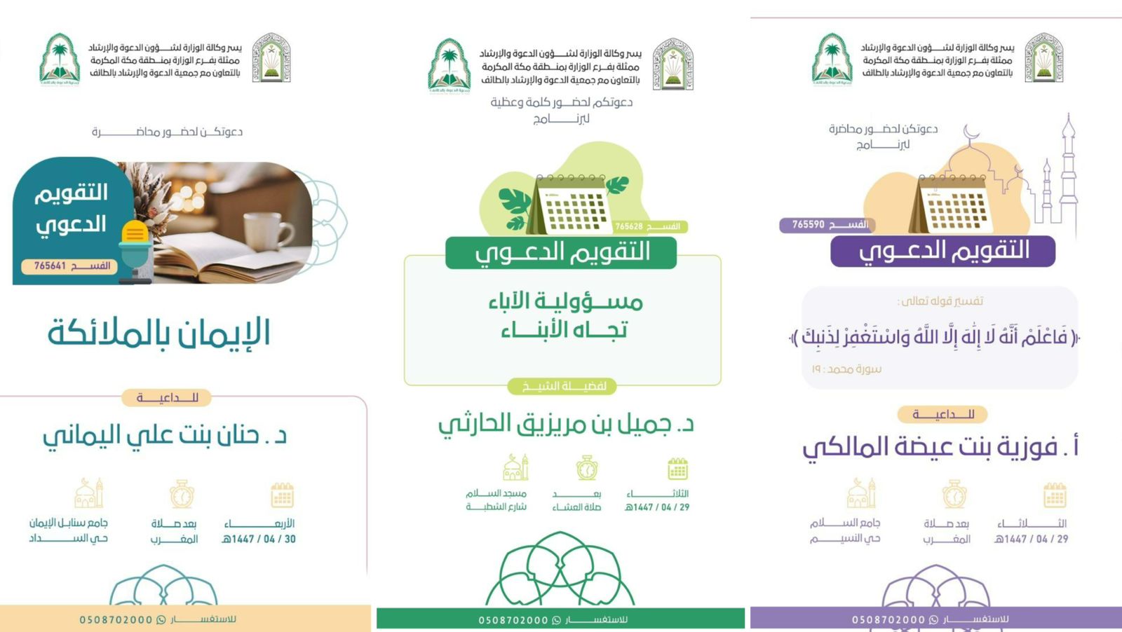 الشؤون الإسلامية بمكة المكرمة تنظم سلسلة من المحاضرات الدعوية النسائية بمحافظة الطائفنظّم فرع وزارة الشؤون الإسلامية والدعوة والإرشاد بمنطقة مكة المكرمة، ممثلاً بإدارة المساجد والدعوة والإرشاد بمحافظة الطائف، سلسلة من المحاضرات الدعوية النسائية ضمن التقويم الدعوي في عددٍ من الجوامع والمساجد 24/ربيع الثاني/1447 التفاصيل