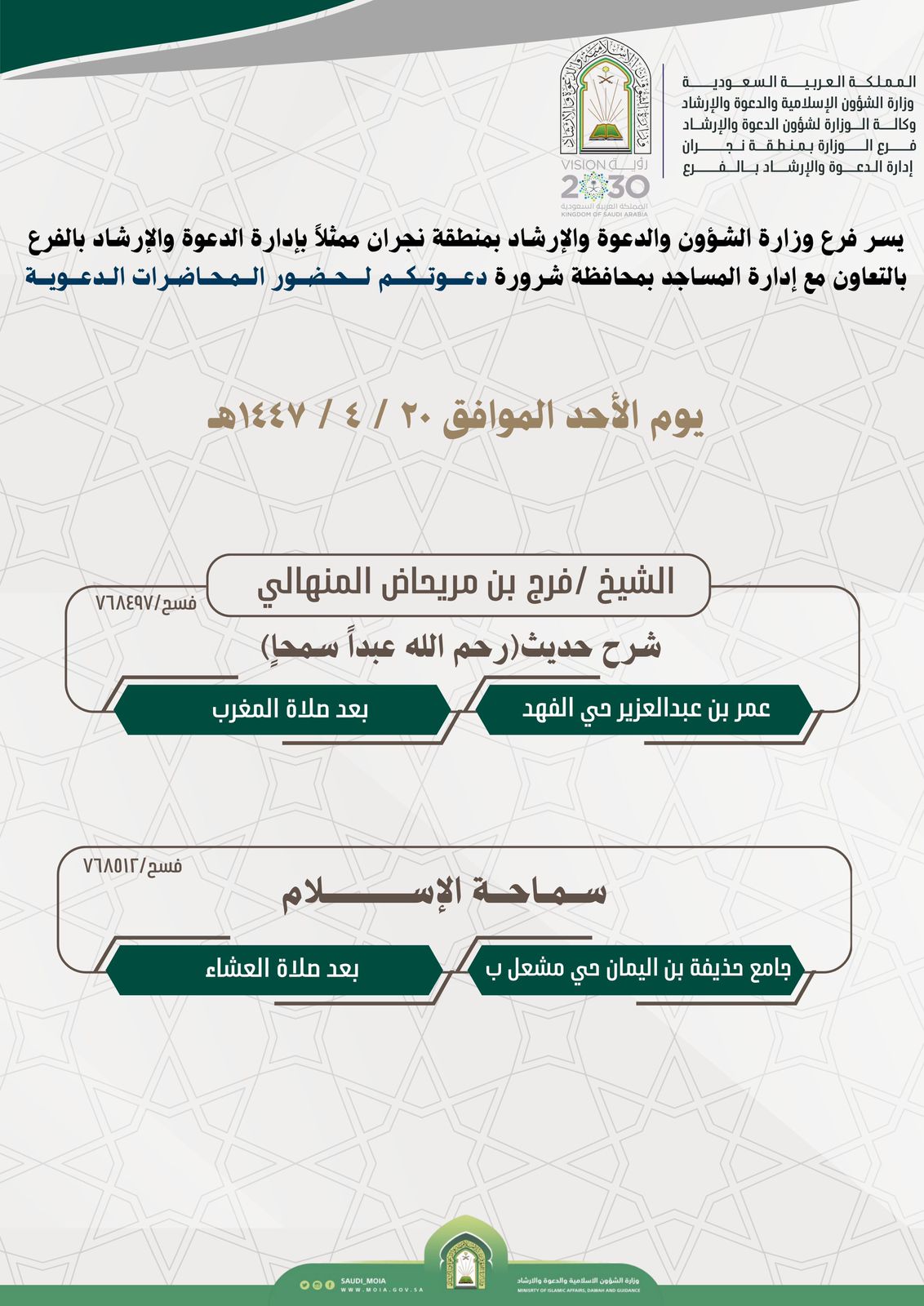 الشؤون الإسلامية بنجران تنفذ محاضرات دعوية بمحافظة شرورةMOIA20/ربيع الثاني/1447MOIAالإدارة العامة للإعلام والإتصال المؤسسيينفّذ فرع وزارة الشؤون الإسلامية والدعوة والإرشاد بمنطقة نجران ممثلاً بإدارة الدعوة والإرشاد بمحافظة شرورة محاضرات دعوية يومي السبت والأحد 19- 20 ربيع الآخر لعام 1447هـ، في عددٍ من الجوامع والمساجد بالمحافظة.وتتناول المحاضرات موضوعات إيمانية وتربوية متنوعة، من أبرزها: “الفوائد من قصة وفاة أبي طالب” و”تفسير قوله تعالى (فاستقم كما أُمرت)” و”شرح حديث (رحم الله عبدًا سمحًا)”.وتأتي هذه المحاضرات ضمن جهود فرع الوزارة في نشر العلم الشرعي وتعزيز القيم الإيمانية والأخلاقية وتوعية المجتمع بوسطية الإسلام وسماحته.