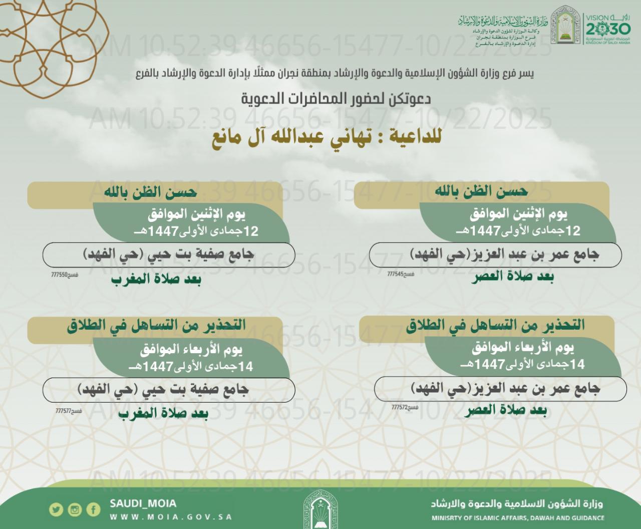 ​ينظّم فرع وزارة الشؤون الإسلامية والدعوة والإرشاد بمنطقة نجران، ممثلاً بإدارة الدعوة والإرشاد، خلال يومَي الاثنين والأربعاء 12 – 14 جمادى الأولى لعام 1447هـ، محاضرتين نسائيتين، ضمن جهود الفرع في تنفيذ المناشط الدعوية الموجّهة للنساء، وتعزيز حضور الأنشطة الدعوية النسائية في جوامع المنطقة.