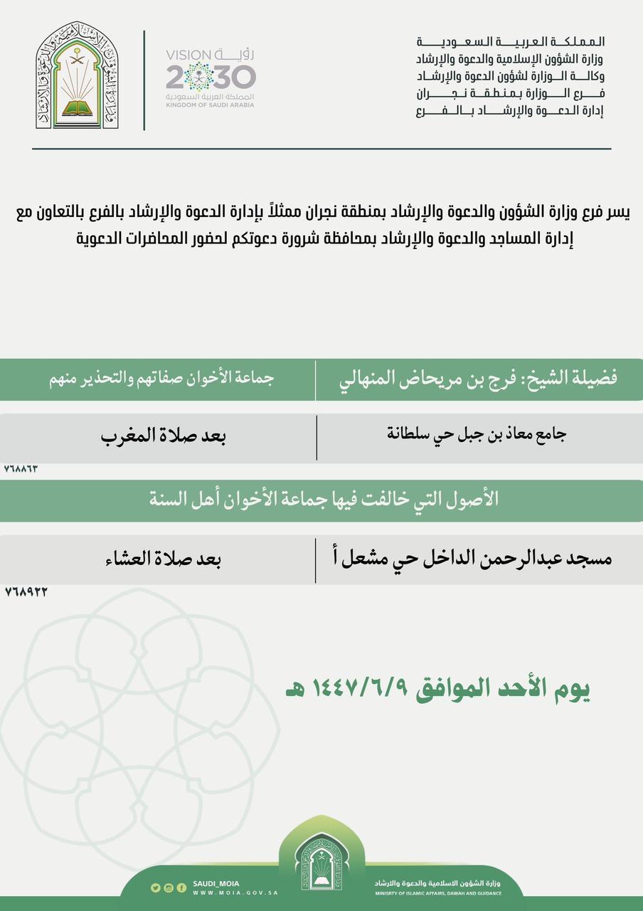 يقيم فرع وزارة الشؤون الإسلامية والدعوة والإرشاد بمنطقة نجران، ممثّلاً بإدارة الدعوة والإرشاد، يومي الخميس والسبت السادس والثامن من جمادى الآخرة لعام 1447هـ، سلسلة من المحاضرات في عددٍ من الجوامع والمساجد