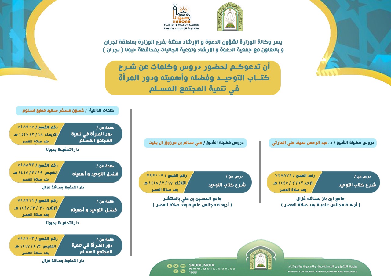الشؤون الإسلامية بنجران تنظم برنامجًا دعويًا بمحافظة حبوناينظم فرع وزارة الشؤون الإسلامية والدعوة والإرشاد بمنطقة نجران، بالتعاون مع جمعية الدعوة والإرشاد وتوعية الجاليات بمحافظة حبونا، اليوم الثلاثاء 17 ربيع الأول 1447هـ، برنامجًا دعويًا متواصلًا يستمر حتى 17/ربيع الأول/1447 التفاصيل