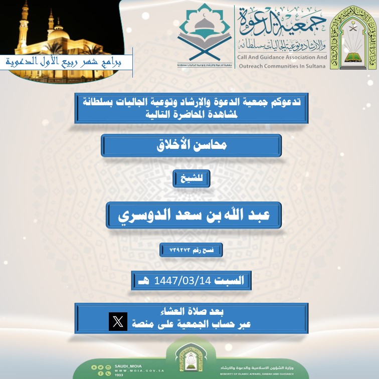 الشؤون الإسلامية بنجران تنظّم محاضرة بعنوان "محاسن الأخلاق"نظّم فرع وزارة الشؤون الإسلامية والدعوة والإرشاد بمنطقة نجران وبالتعاون مع جمعية الدعوة والإرشاد وتوعية الجاليات بسلطانة يوم السبت الرابع عشر من شهر ربيع الأول لعام 1447هـ، محاضرة بعنوان "محاسن 15/ربيع الأول/1447 التفاصيل