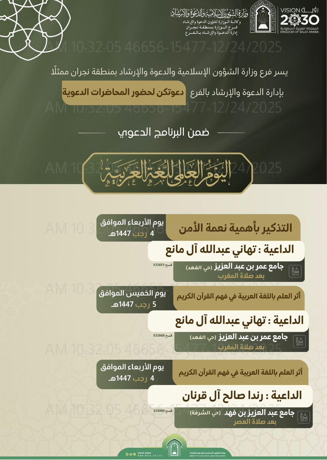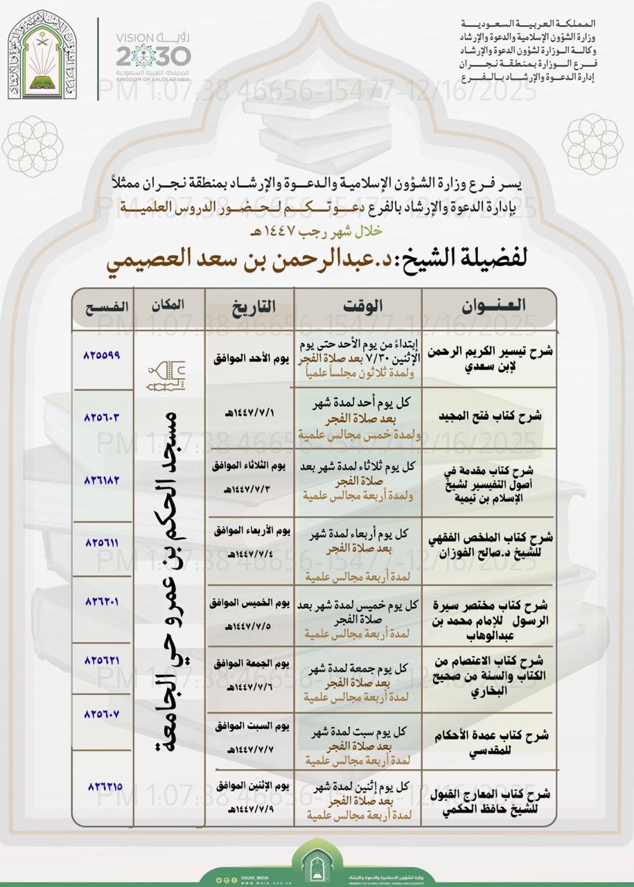 سلسلة من الدروس العلمية تطلقها الشؤون الإسلامية بنجرانتُطلق وزارةُ الشؤون الإسلامية والدعوة والإرشاد، ممثَّلةً بفرعها في منطقة نجران، - إدارة الدعوة والإرشاد- اليوم الأحد الأول من شهر رجب لعام 1447هـ، سلسلةً من الدروس العلمية في عددٍ من جوامع ومساجد المنطقة، 01/رجب/1447 التفاصيل