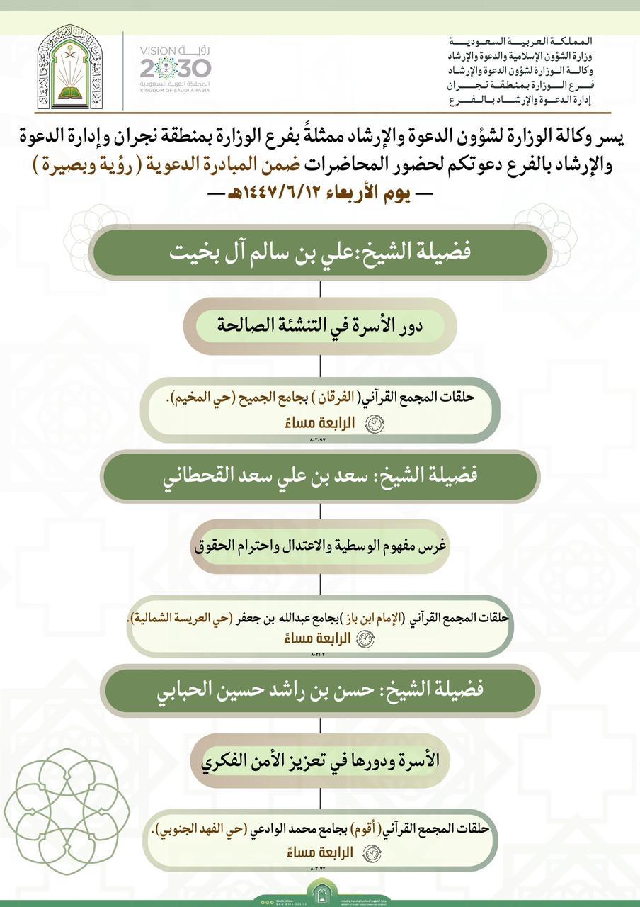 الشؤون الإسلامية بنجران تنظم درسًا علميًا ومحاضرتين بالمنطقةينظم فرعُ وزارة الشؤون الإسلامية والدعوة والإرشاد بمنطقة نجران، ممثّلاً بإدارة الدعوة والإرشاد، اليوم الأربعاء الخامس من جمادى الآخرة لعام 1447هـ، درسًا علميًا ومحاضرتين في عددٍ من الجوامع والمساجد 05/جمادى الثانية/1447 التفاصيل
