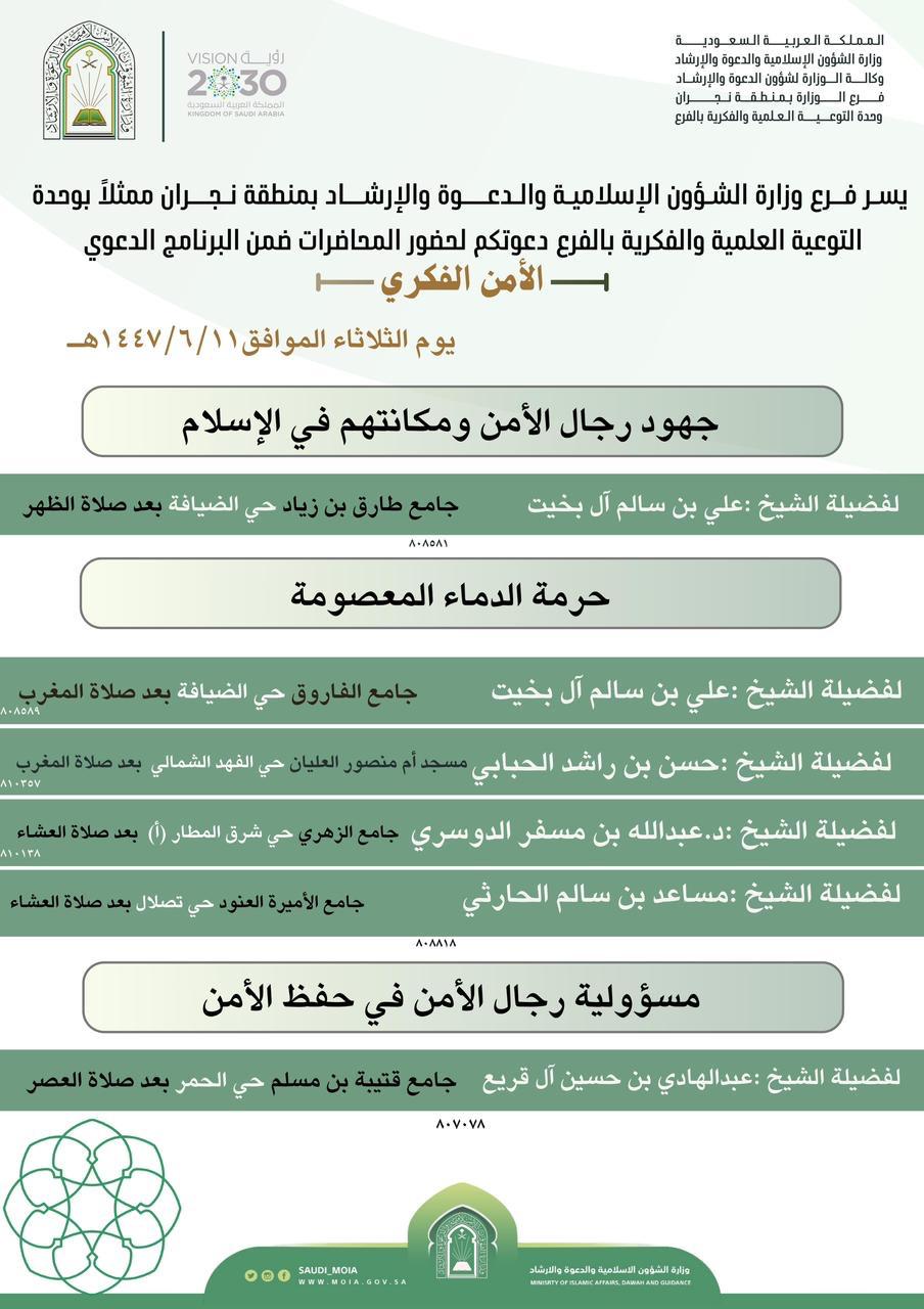 فرع الشؤون الإسلامية بنجران يُنفّذ برنامجًا توعويًا حول الأمن الفكري في جوامع ومساجد المنطقةينفذ فرعُ وزارة الشؤون الإسلامية والدعوة والإرشاد بمنطقة نجران، ممثلاً بوحدة التوعية العلمية والفكرية، يوم الأحد التاسع من شهر جمادى الآخرة للعام 1447هـ ، محاضرة ضمن برنامج "الأمن الفكري"، 09/جمادى الثانية/1447 التفاصيل