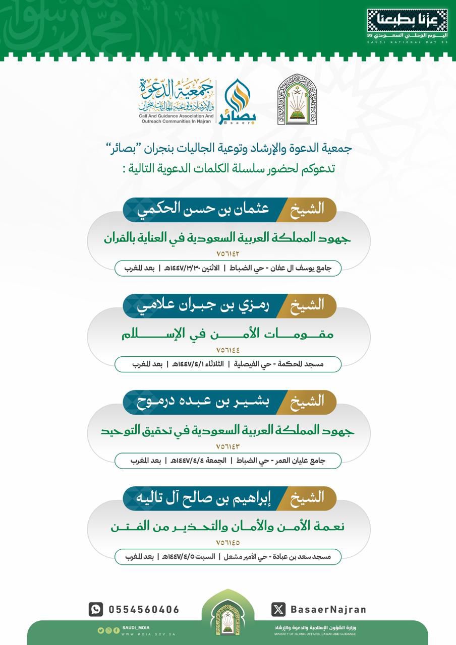 يطلق فرع وزارة الشؤون الإسلامية والدعوة والإرشاد بمنطقة نجران، اليوم الأربعاء الثاني وحتى الثالث من شهر ربيع الآخر 1447هـ، برنامجاً دعوياً يشمل محاضرات وكلمات دعوية، تزامناً مع اليوم الوطني الخامس والتسعين
