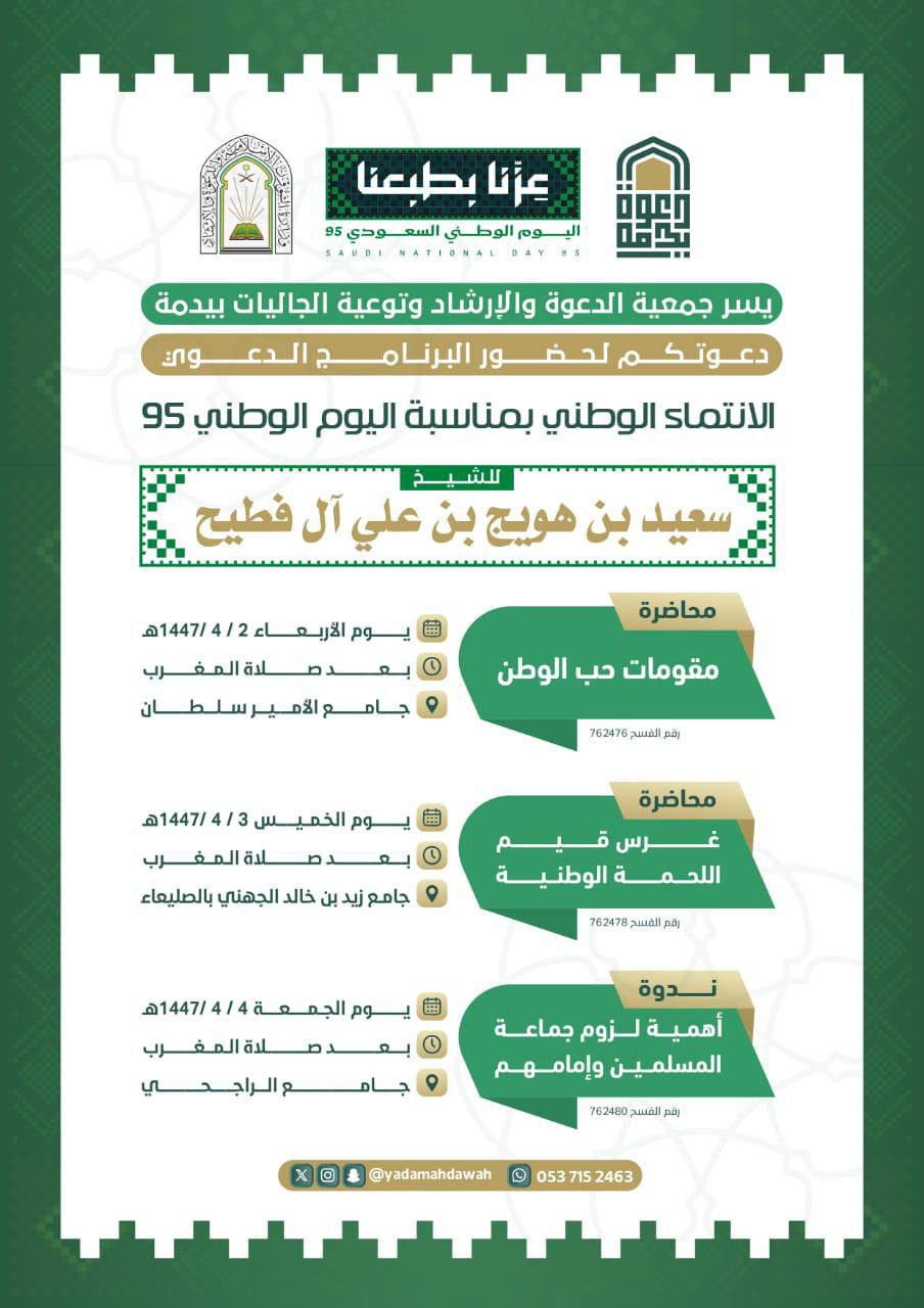 • الشؤون الإسلامية بنجران تنظم برنامجاً دعوياً بعنوان " الانتماء الوطني " بمناسبة اليوم الوطني الـ95 في يدمة