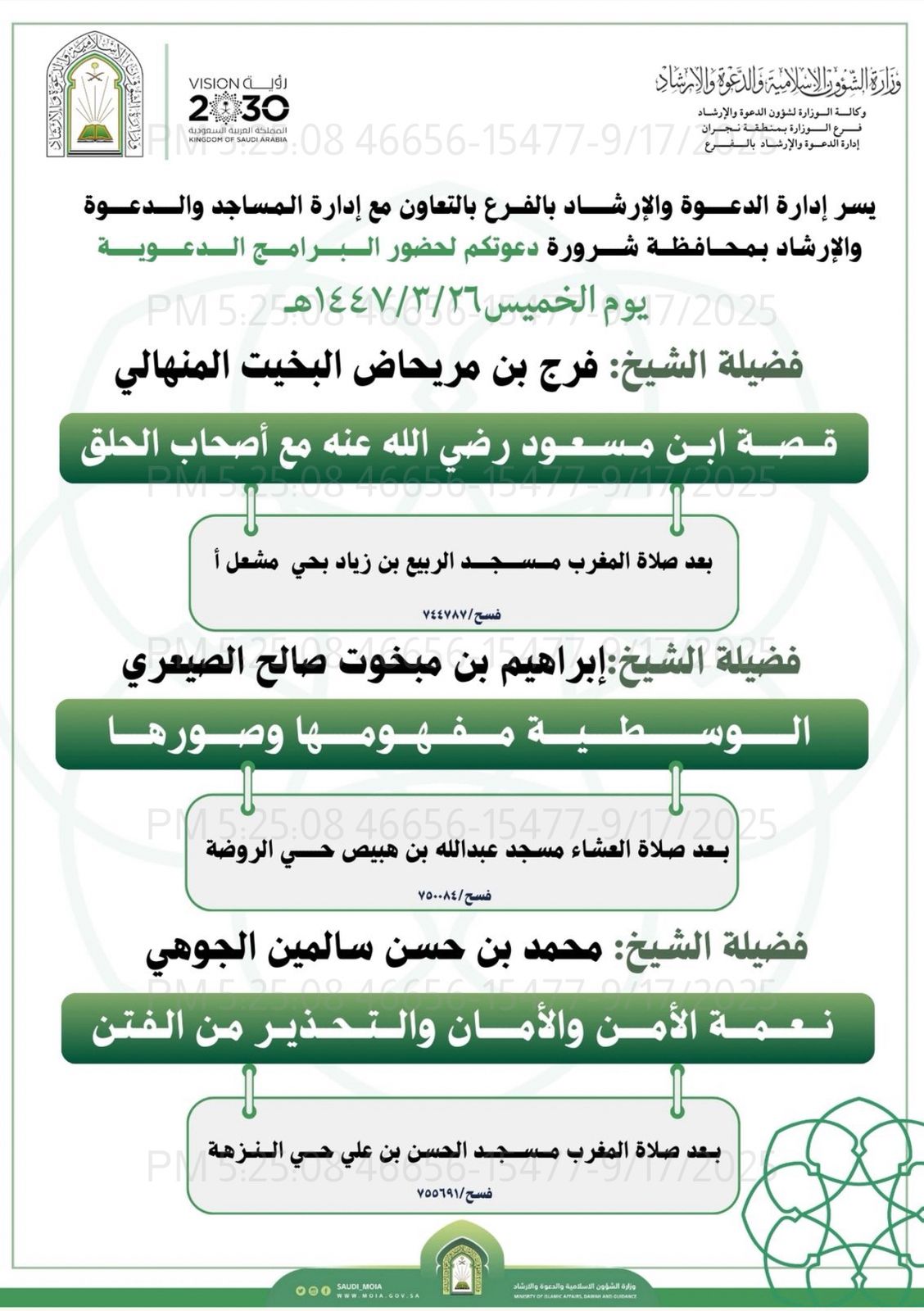 ​ينظم فرع وزارة الشؤون الإسلامية والدعوة والإرشاد بمنطقة نجران، اليوم الخميس الموافق 26 ربيع الأول لعام 1447هـ، برنامجًا دعويًا في بعض مساجد محافظة شرورة.