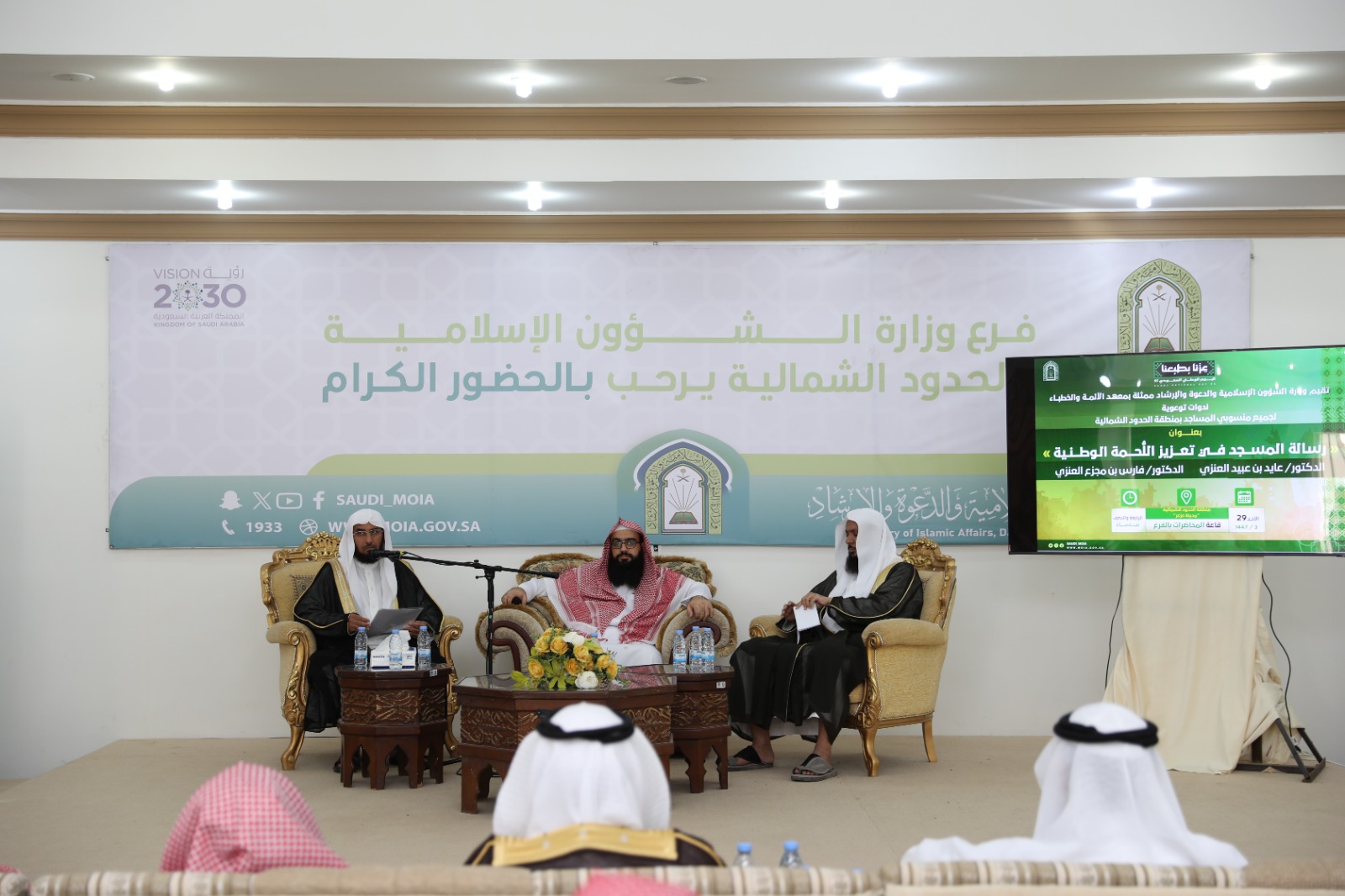 الشؤون الإسلامية تنظّم ندوة بعنوان "رسالة المسجد في تعزيز اللحمة الوطنية"بمناسبة اليوم الوطني الـ95 بمنطقة الحدود الشماليةMOIA30/ربيع الأول/1447MOIAالإدارة العامة للإعلام والإتصال المؤسسيالشؤون الإسلامية تنظّم ندوة بعنوان رسالة المسجد في تعزيز اللحمة الوطنية بمناسبة اليوم الوطني الـ95 بمنطقة الحدود الشماليةنظّمت وزارة الشؤون الإسلامية والدعوة والإرشاد، ممثلةً بمعهد الأئمة والخطباء، يوم الأحد التاسع والعشرين من شهر ربيع الأول لعام 1447هـ، ندوة توعوية بعنوان: "رسالة المسجد في تعزيز اللحمة الوطنية"، وذلك في قاعة فرع الوزارة بمدينة عرعر، بحضور منسوبي المساجد من خطباء وأئمة ومؤذنين ومراقبين ومراقبات، في تمام الساعة الرابعة والنصف مساءً.وتناولت الندوة عددًا من المحاور، من أبرزها: دور المسجد في بناء اللحمة الوطنية وتعزيز قيم الانتماء والولاء، وترسيخ المسؤولية الشرعية والوطنية لمنسوبي المساجد في الخطاب الدعوي والإرشادي. وتأتي هذه الندوة ضمن الأنشطة والبرامج التي ينفذها معهد الأئمة والخطباء في مختلف مناطق المملكة، تأكيدًا لرسالة الوزارة في نشر قيم الوسطية والاعتدال، والعناية بالمساجد ومنسوبيها.
