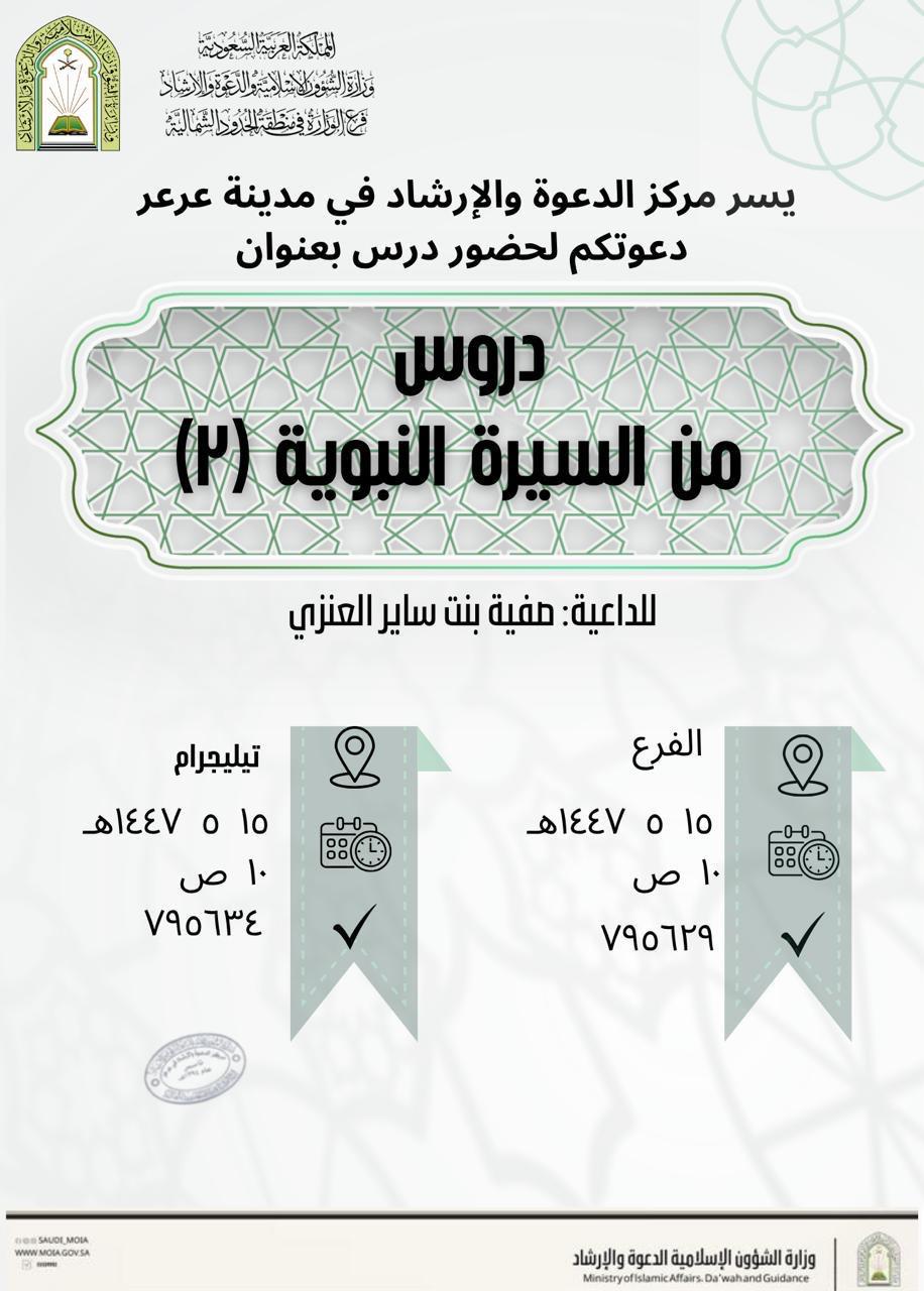 سلسلة أنشطة دعوية متنوعة تنفّذها الشؤون الإسلامية بالحدود الشمالية في محافظة رفحاءنفّذ فرع وزارة الشؤون الإسلامية والدعوة والإرشاد بمنطقة الحدود الشمالية، ممثلاً بإدارة المساجد والدعوة والإرشاد بمحافظة رفحاء، خلال الفترة من الأحد إلى الخميس الموافق 11 – 15 جمادى الأولى 1447هـ، سلسلةً 19/جمادى الأولى/1447 التفاصيل