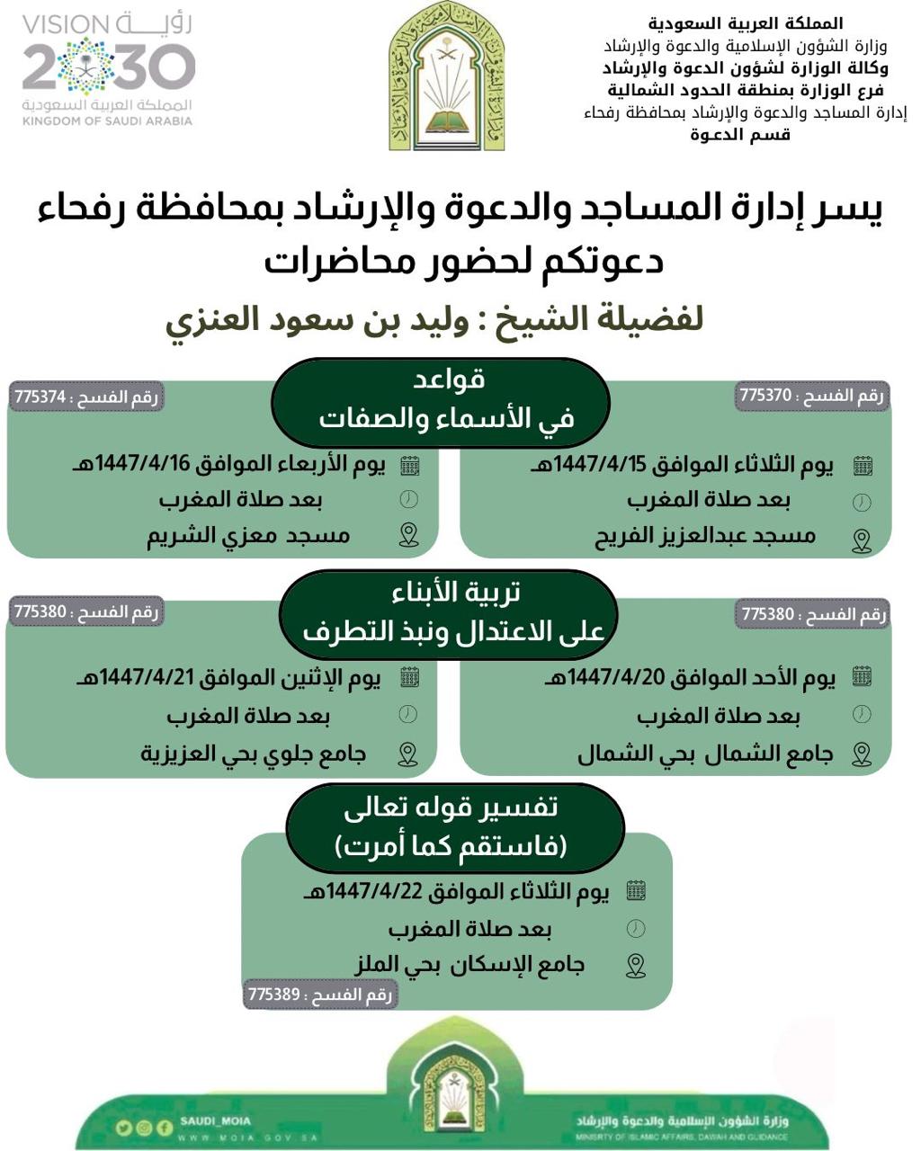 ​أقام فرع وزارة الشؤون الإسلامية والدعوة والإرشاد بمنطقة الحدود الشمالية، ممثلاً بإدارة المساجد والدعوة والإرشاد، خلال الفترة من 20 إلى 24 من شهر ربيع الآخر لعام 1447هـ، سلسلةً من المحاضرات والدروس الدعوية،