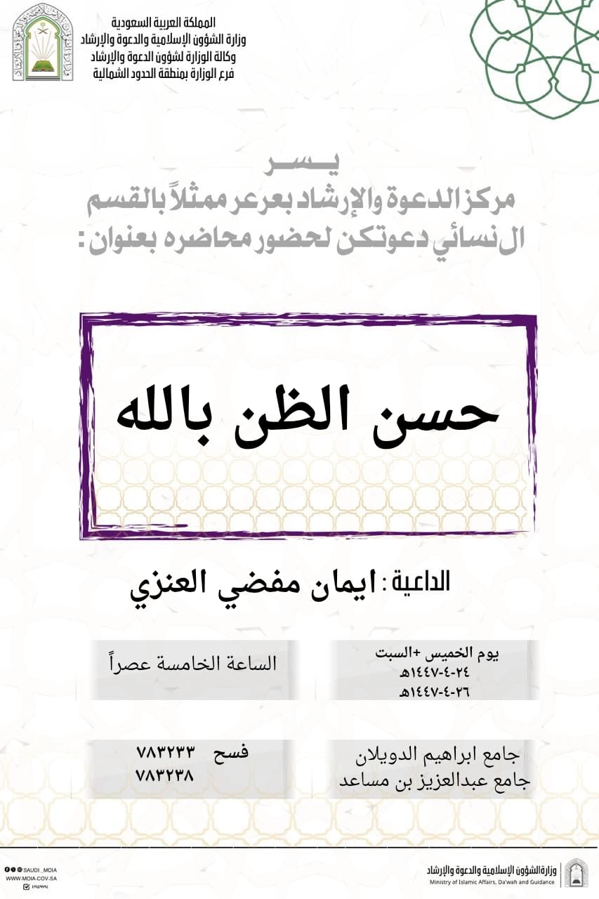 أنشطة دعوية نسائية تنفّذها الشؤون الإسلامية في الحدود الشماليةنفّذ فرع وزارة الشؤون الإسلامية والدعوة والإرشاد بمنطقة الحدود الشمالية، ممثلاً بإدارة المساجد والدعوة والإرشاد القسم النسائي بمحافظة رفحاء عددًا من المناشط الدعوية النسائية ، وذلك خلال الفترة من 21/ربيع الثاني/1447 التفاصيل