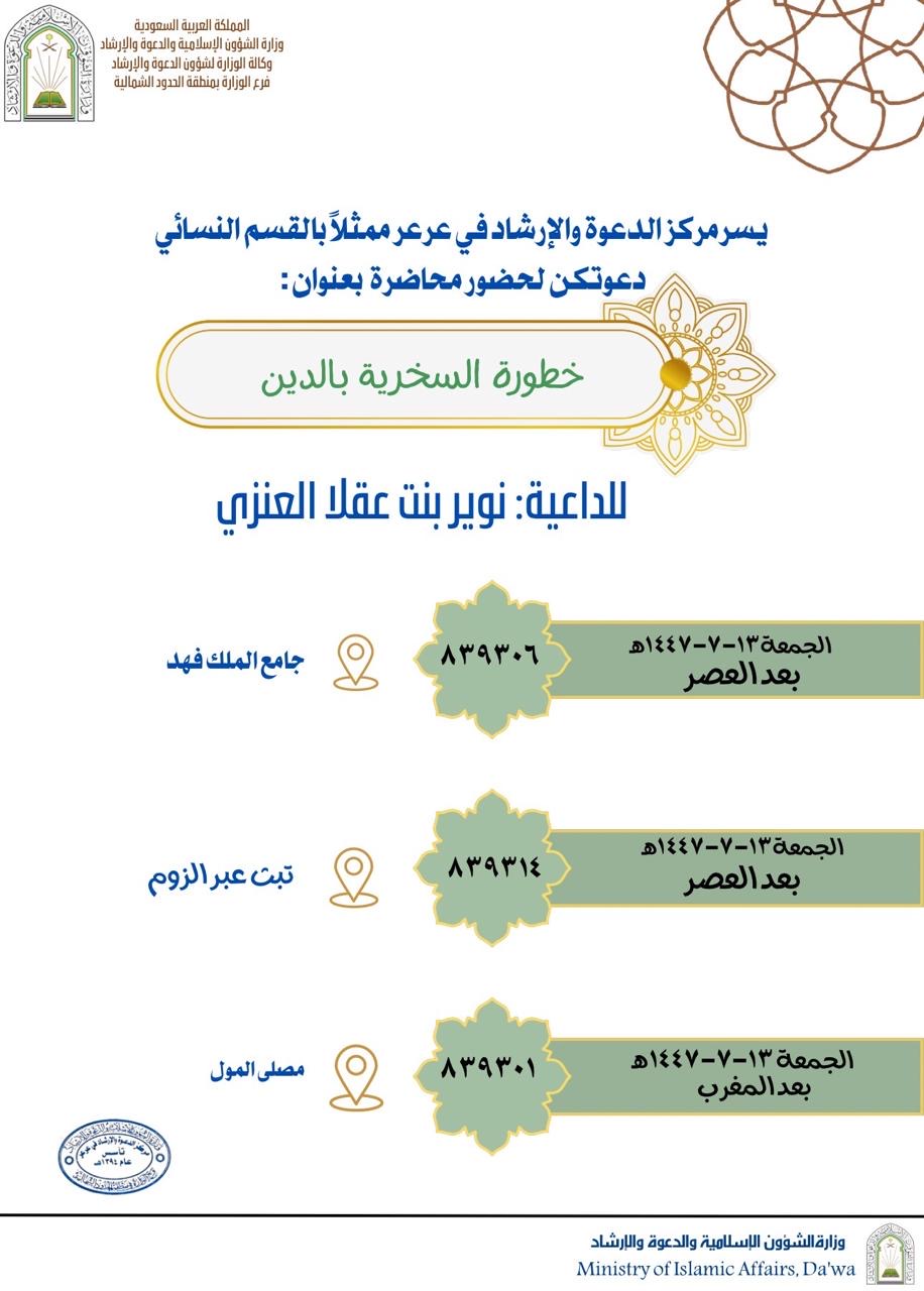 الشؤون الإسلامية بالحدود الشمالية تُنفّذ سلسلة مناشط دعوية في عرعرنفّذت وزارةُ الشؤون الإسلامية والدعوة والإرشاد، ممثّلةً بفرعها في منطقة الحدود الشمالية،مركز الدعوة والإرشاد بمدينة عرعر، سلسلةً من المناشط الدعوية، قدّمها نخبةٌ من الدعاة، وذلك خلال الفترة من الثامن 17/رجب/1447 التفاصيل