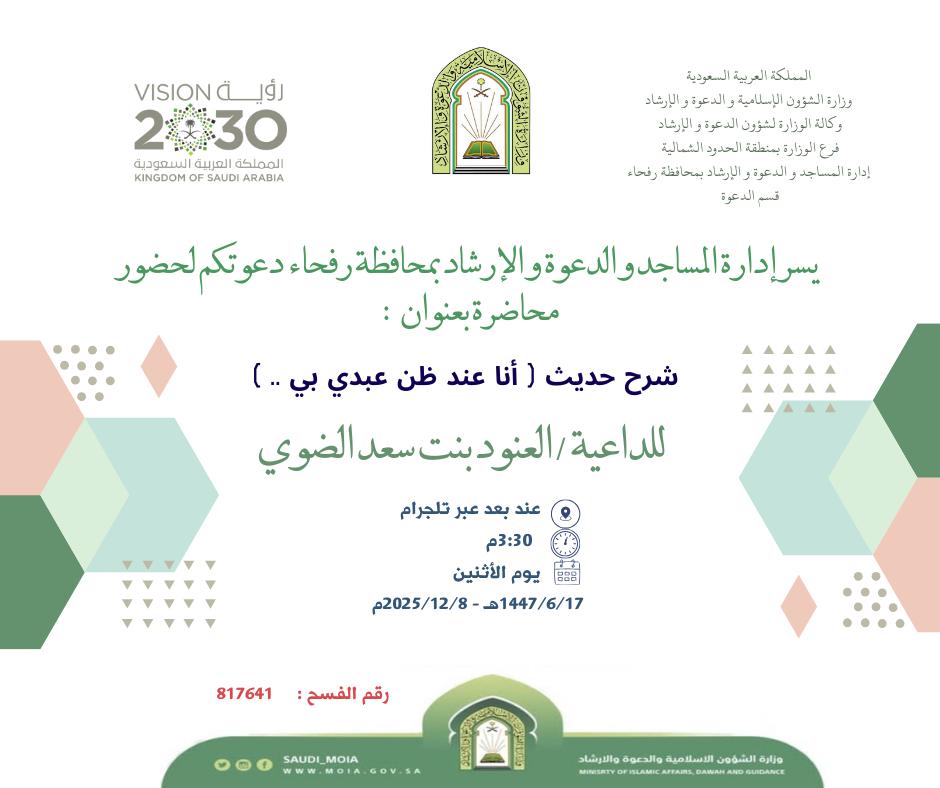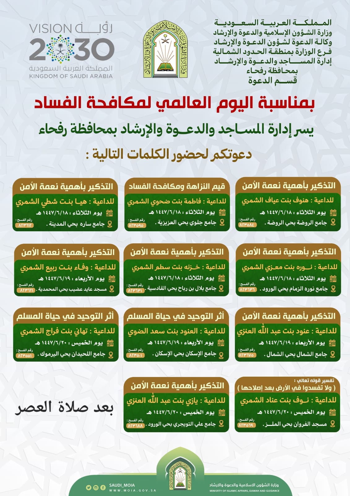 برنامج دعوي بعنوان "التذكير بأهمية نعمة الأمن" تُنفّذه الشؤون الإسلامية بالحدود الشمالية برفحاءنفّذت وزارةُ الشؤون الإسلامية والدعوة والإرشاد ممثّلةً بفرعها بمنطقة الحدود الشمالية - إدارة المساجد والدعوة والإرشاد بمحافظة رفحاء-، برنامجًا دعويًا تضمّن عددًا من الكلمات الشرعية بعنوان "التذكير 20/جمادى الثانية/1447 التفاصيل