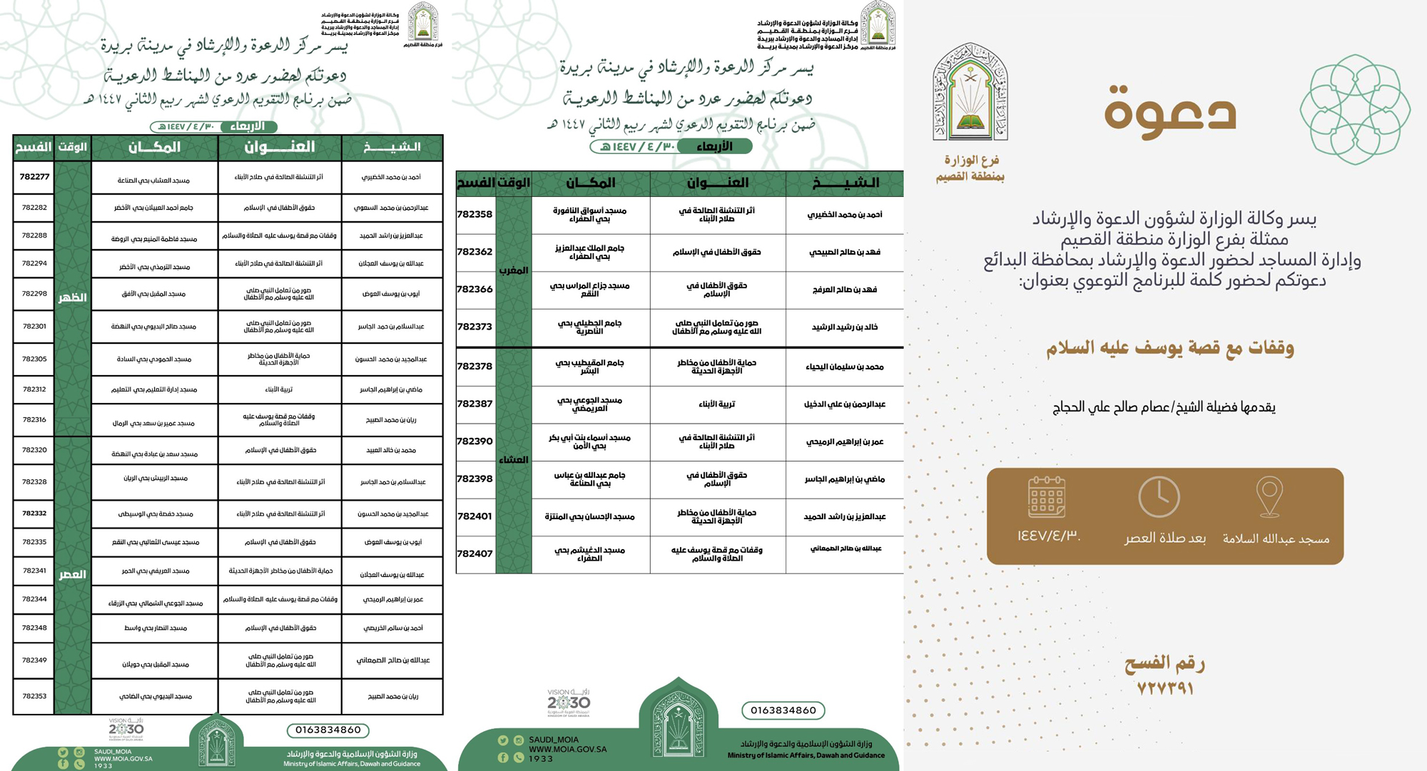 الشؤون الإسلامية بالقصيم تنفذ عدداً من المناشط بمدينة بريدة ومحافظة البدائعMOIA30/ربيع الثاني/1447MOIAالإدارة العامة للإعلام والإتصال المؤسسيينفذ فرع وزارة الشؤون الإسلامية والدعوة والإرشاد بمنطقة القصيم، ممثلاً بمركز الدعوة والإرشاد بمدينة بريدة، وإدارة المساجد والدعوة والإرشاد بمحافظة البدائع، عددًا من المناشط الدعوية ، اليوم الأربعاء 30 ربيع الآخر 1447هـ، مجموعة من المحاضرات والكلمات الوعظية.واشتملت على موضوعات عدة من أبرزها: أثر التنشئة الصالحة في صلاح الأبناء، وحقوق الأطفال في الإسلام، وقفات مع قصة يوسف علية الصلاة والسلام، وصور من تعامل النبي صلى الله عليه وسلم مع الأطفال، حماية الأطفال من مخاطر الأجهزة الحديثة، وتربية الأبناء، وذلك في عدد من الجوامع والمساجد ووقفات مع قصة يوسف عليه السلام.ويستمر الفرع في تنفيذ هذه المناشط على مدار العام، في إطار جهوده التوعوية الرامية إلى تعميق القيم الإسلامية، وبناء مجتمع واعٍ ومتماسك، قادر على مواجهة الانحرافات الفكرية والسلوكية.
