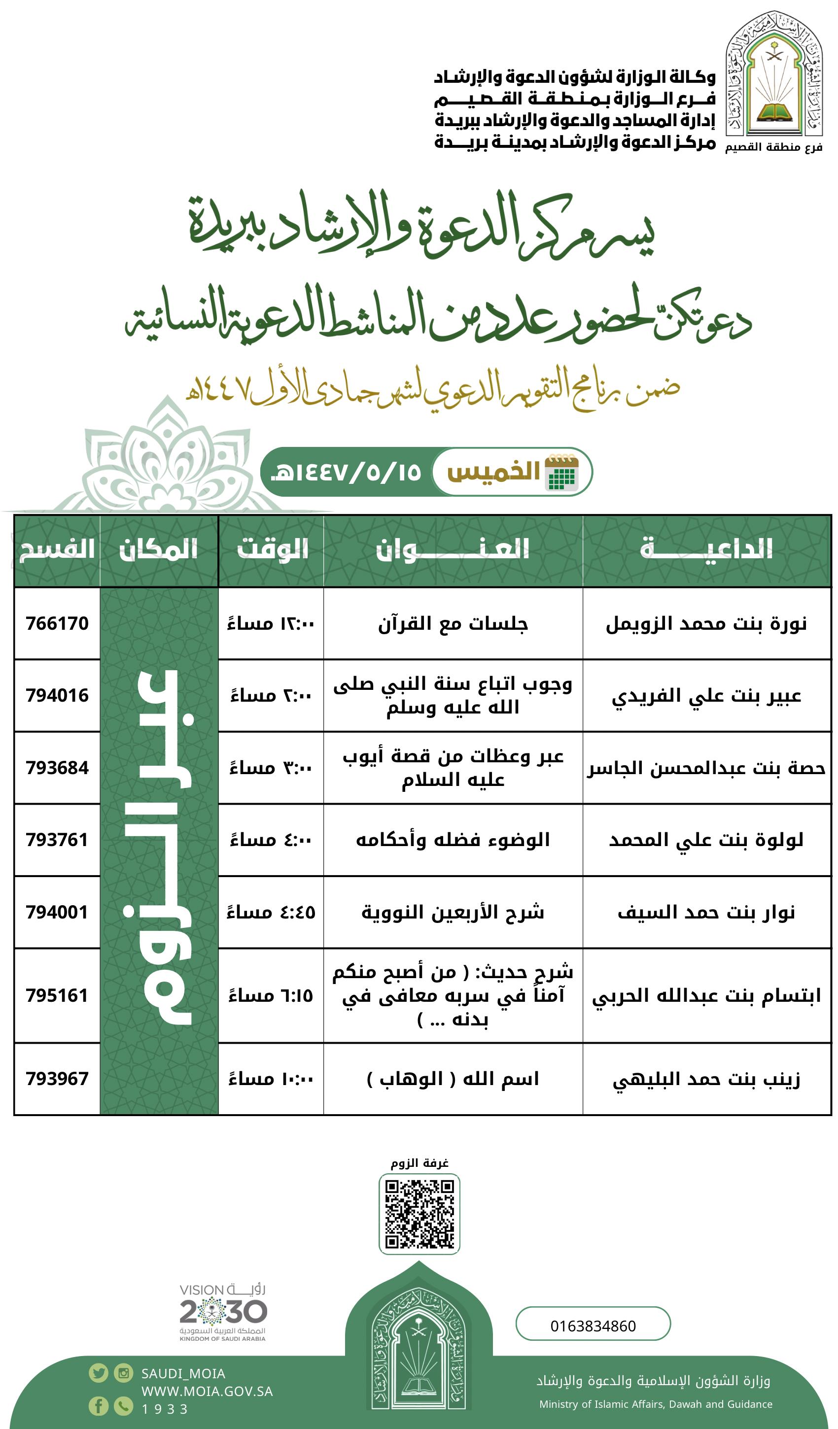 ​ينفذ فرع وزارة الشؤون الإسلامية والدعوة والإرشاد بمنطقة القصيم، ممثلاً بمركز الدعوة والإرشاد بمدينة بريدة، عدداً من المناشط النسائية، اليوم الخميس ١٥ جمادى الأولى 1447هـ  ضمن برنامج التقويم الدعوي الشهري.
