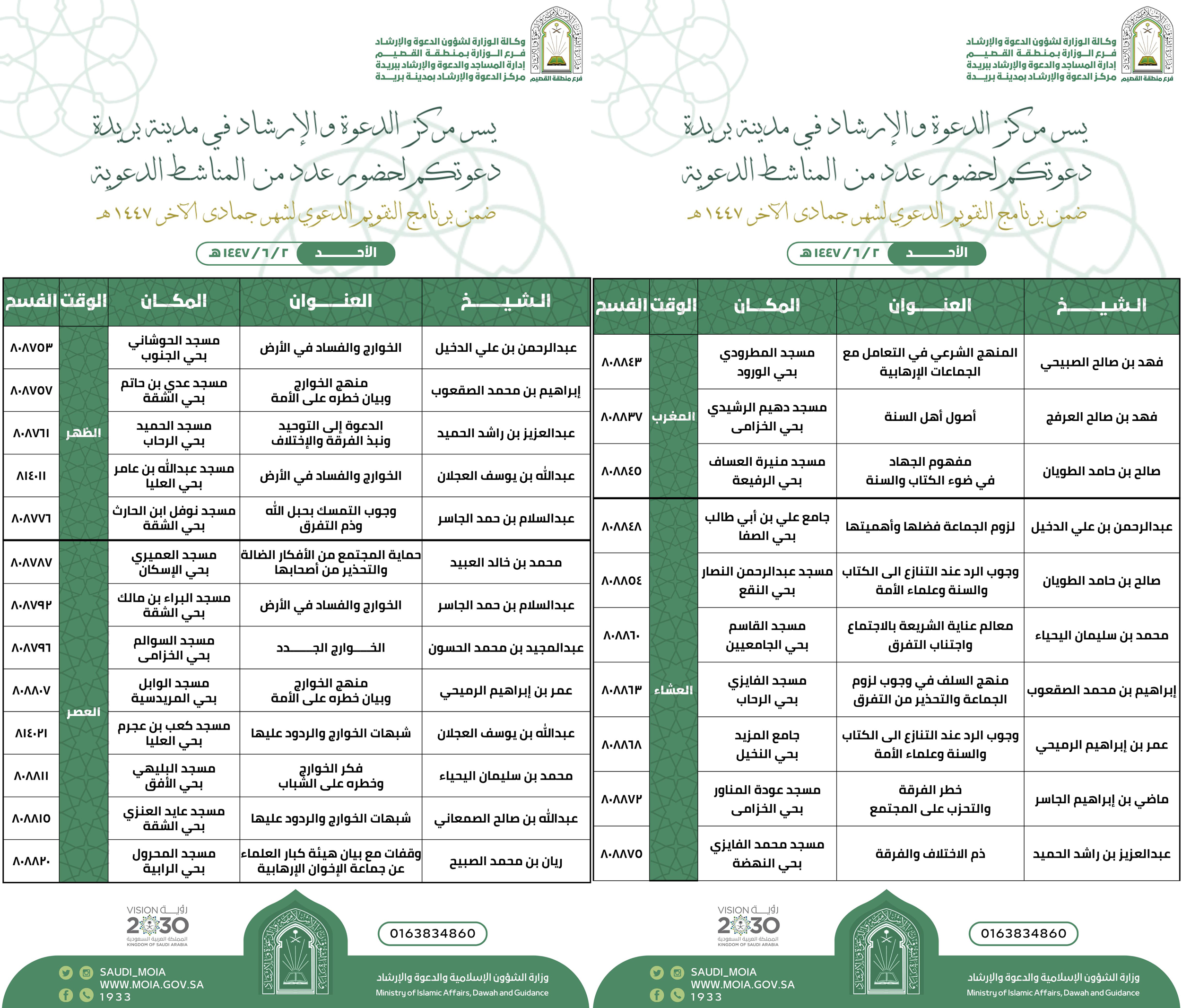 الشؤون الإسلامية بالقصيم تنفذ عدداً من المناشط الدعوية بمدينة بريدةMOIA02/جمادى الثانية/1447MOIAالإدارة العامة للإعلام والإتصال المؤسسيينفذ فرع وزارة الشؤون الإسلامية والدعوة والإرشاد بمنطقة القصيم، ممثلاً بمركز الدعوة والإرشاد بمدينة بريدة، اليوم الأحد 2 جمادى الآخرة 1447هـ عددًا من المناشط الدعوية " ضمن برنامج التقويم الدعوي الشهري ". والتي اشتملت على موضوعات عدة، من أبرزها: الخوارج والفساد في الأرض ، ومنهج الخوارج وبيان خطره على الأمة ، و الدعوة إلى التوحيد ونبذ الفرقة والاختلاف ، ووجوب التمسك بحبل الله وذم التفرق ، وحماية المجتمع من الأفكار الضالة والتحذير من أصحابها ، والخوارج الجدد ، وشبهات الخوارج والردود عليها ، وفكر الخوارج وخطره على الشباب ، ووقفات مع بيان هيئة كبار العلماء عن جماعة الإخوان الإرهابية ، والمنهج الشرعي في التعامل مع الجماعات الإرهابية ، وأصول أهل السنة ، ومفهوم الجهاد في ضوء الكتاب والسنة ، ولزوم الجماعة فضلها وأهميتها ، ووجوب الرد عند التنازع الى الكتاب والسنة وعلماء الأمة ، ومعالم عناية الشرعية بالاجتماع واجتناب التفرق ، وخطر الفرقة والتحزب على المجتمع ، وذم الاختلاف والفرقة. ويواصل فرع الوزارة بمنطقة القصيم تنفيذ برامجه الدعوية والتوعوية على مدار العام، ضمن جهوده الرامية إلى تعزيز القيم الإسلامية، وترسيخ منهج الوسطية والاعتدال، وبناء مجتمع واعٍ ومتماسك قادر على مواجهة الانحرافات الفكرية والسلوكية.