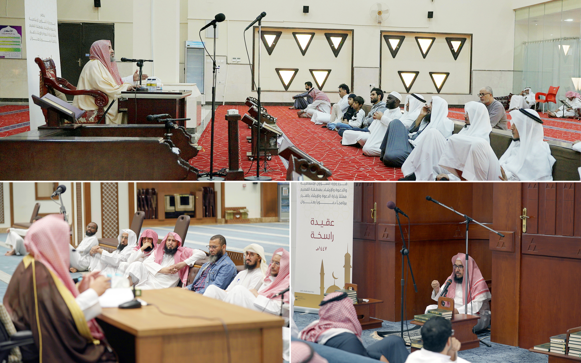 الشؤون الإسلامية بالقصيم تواصل تنفيذ برنامج "عقيدة راسخة 1447هـ"MOIA02/جمادى الثانية/1447MOIAالإدارة العامة للإعلام والإتصال المؤسسييواصل فرع وزارة الشؤون الإسلامية والدعوة والإرشاد بمنطقة القصيم، ممثلا بإدارة الدعوة بالفرع، تنفيذ برنامج "عقيدة راسخة 1447هـ"، الذي انطلق يوم الثلاثاء 27 جمادى الآخرة 1447هـ ويهدف إلى ترسيخ العقيدة الصحيحة، ونشر العلم الشرعي بين أفراد المجتمع، وتعزيز الوعي الديني، وحماية المجتمع من الأفكار المنحرفة. حيث أقام الفرع عدة دروس الأول بعنوان "شرح الأصول الستة" بجامع الحناكي، وكلمة بعنوان "تعظيم التوحيد" في مسجد أنس بن النضر، ودرس "شرح كتاب العقيدة الواسطية" بجامع المزيني، بمحافظة الرس كما أُلقيت كلمة بعنوان "معنى شهادة أن لا إله إلا الله وأن محمد رسول الله" بجامع السعدي، ودرس "شرح أصول السنة للإمام أحمد" بجامع المصيريعي، بمحافظة عنيزة. وجاءت كلمة بعنوان "فضل سورة الفاتحة" بمسجد أبي الدرداء، وكلمة "أهمية التوحيد" بجامع المبيريك، إلى جانب درس "شرح القواعد الأربع للإمام محمد بن عبد الوهاب" بجامع الراجحي، وكلمة "فضل التوحيد وخطر الشرك" بجامع النصيان، وكلمة "محاسن الأخلاق" بجامع الحبلين، في مدينة بريدة. ويستمر البرنامج في تقديم الدروس والكلمات العلمية في مختلف المحافظات لتعزيز العقيدة الصحيحة والوعي الديني. ويأتي هذا البرنامج ضمن البرامج الدعوية لفرع الوزارة بمنطقة القصيم لتوعية الناس بما ينفعهم بدينهم ودنياهم.
