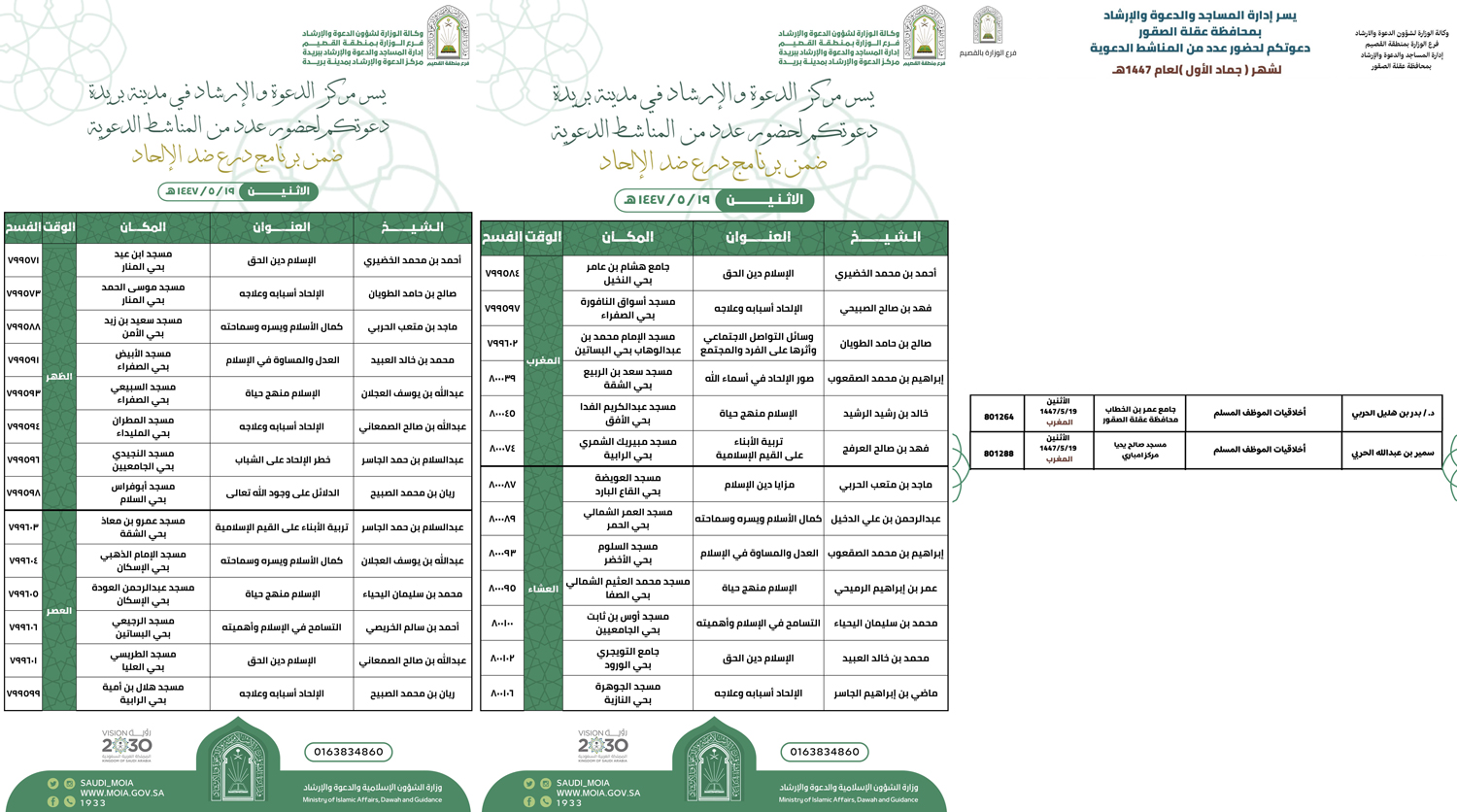 الشؤون الإسلامية بالقصيم تنفذ عدداً من المناشط الدعوية ببريدة وعقلة الصقورينفذ فرع وزارة الشؤون الإسلامية والدعوة والإرشاد بمنطقة القصيم، ممثلاً بمركز الدعوة والإرشاد بمدينة بريدة وإدارة المساجد الدعوة والإرشاد بمحافظة عقلة الصقور ، ينفذ اليوم الاثنين ١9 جمادى الأولى 19/جمادى الأولى/1447 التفاصيل